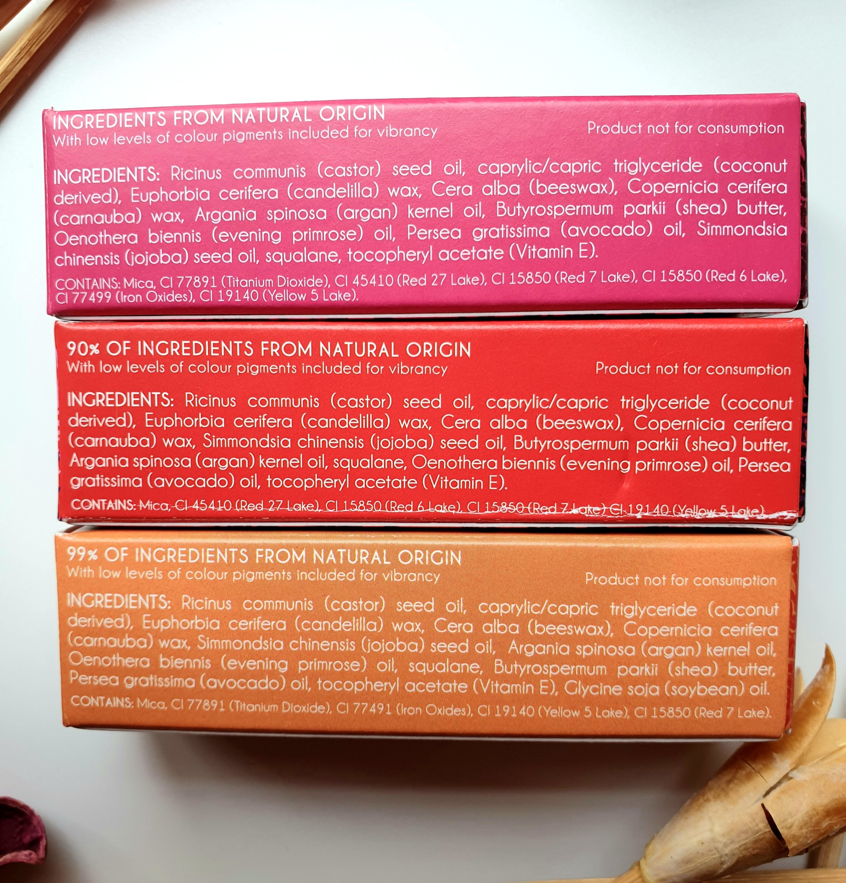 Full ingredients list: Ricinus communis (castor) oil, caprylic/capric triglyceride (coconut derived), Euphorbia cerifera (candelilla) wax, Cera alba (beeswax), Copernicia cerifera (carnauba) wax, Persea gratissima (avocado) oil, Oenothera biennis (evening primrose) oil, Argania spinosa (argan) kernel oil, Butyrospermum parkii (shea) butter, Simmondsia chinensis (jojoba) seed oil, squalane, tocopheryl acetate (Vitamin E). CONTAINS: Mica, CI 77891 (Titanium Dioxide), CI 45410 (Red 27 Lake), CI 15850 (Red 7 Lake), CI 15850 (Red 6 Lake), CI 77499 (Iron Oxides), CI 19140 (Yellow 5 Lake).