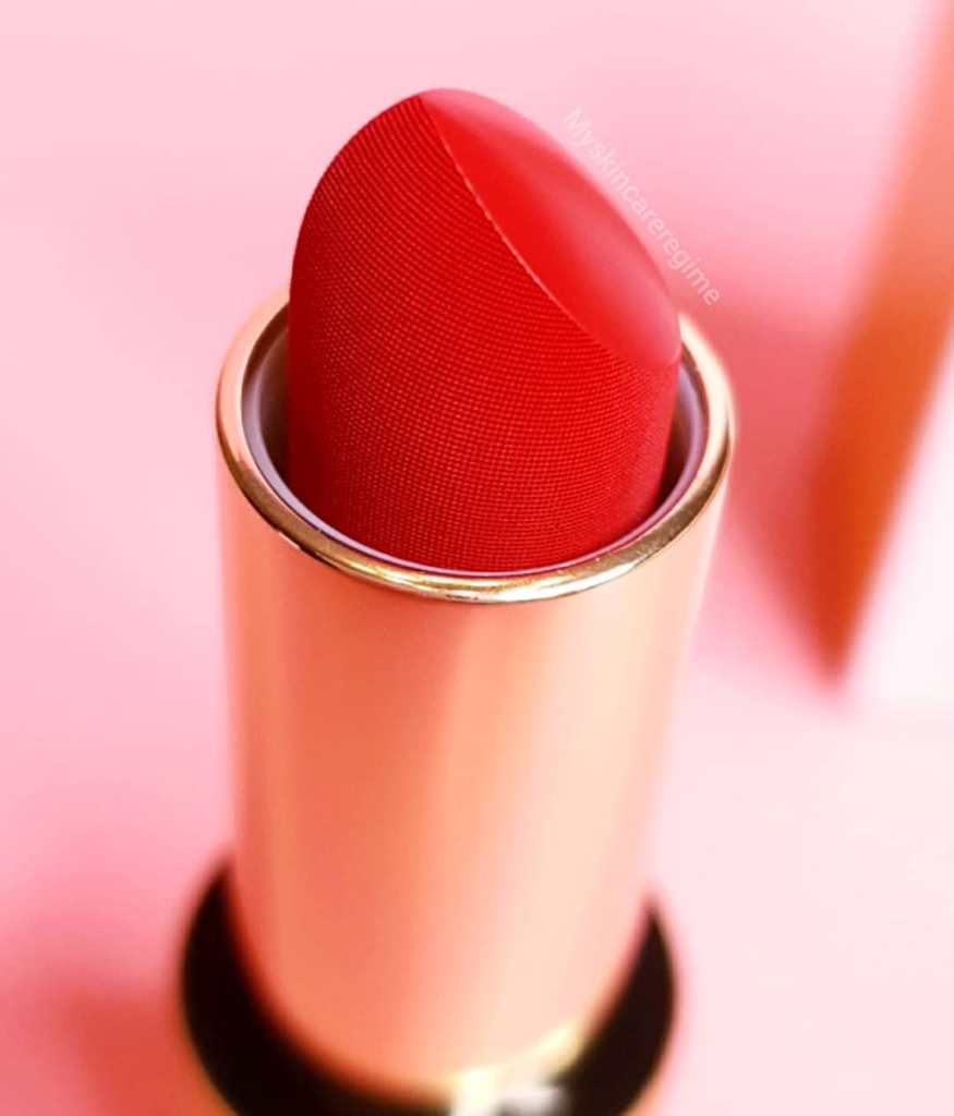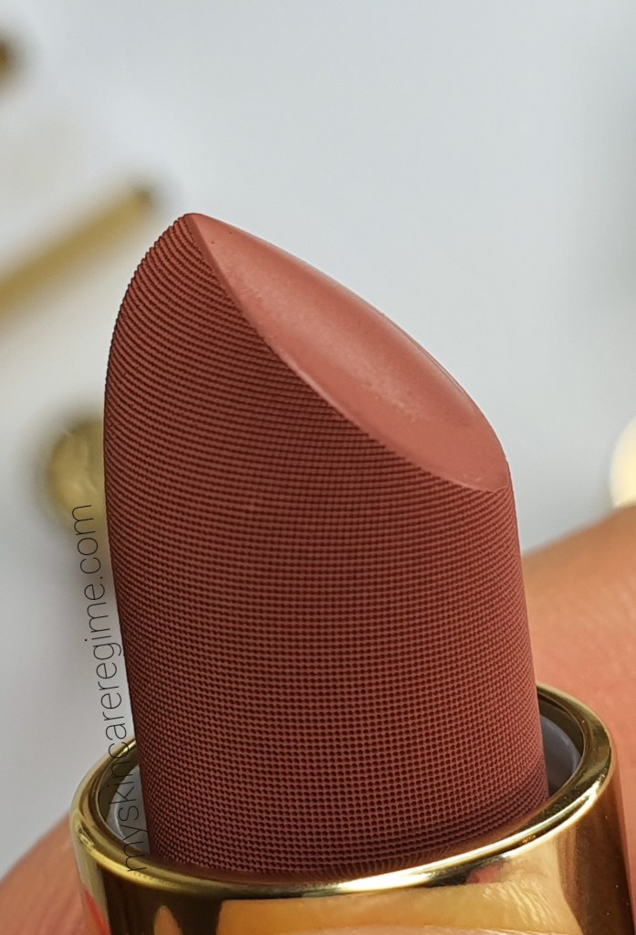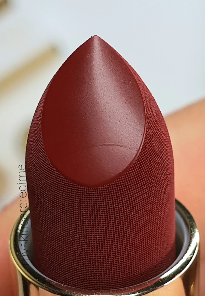 I can say, after eating and drinking, these lipsticks, in terms of texture on the lips, turn a bit ‘grainy’. I don’t think they are drying or uncomfortable, but I think eating sort of removes the ‘top’ layer of this lipstick which leaves underneath a sort of grainy-ness. (but of course you’d have to re-touch if you eat). The grainy-ness is a little uncomfortable, but once you re-apply, that feeling semi goes away. The pigmentation is there, I always get compliments when I wear this lipstick.