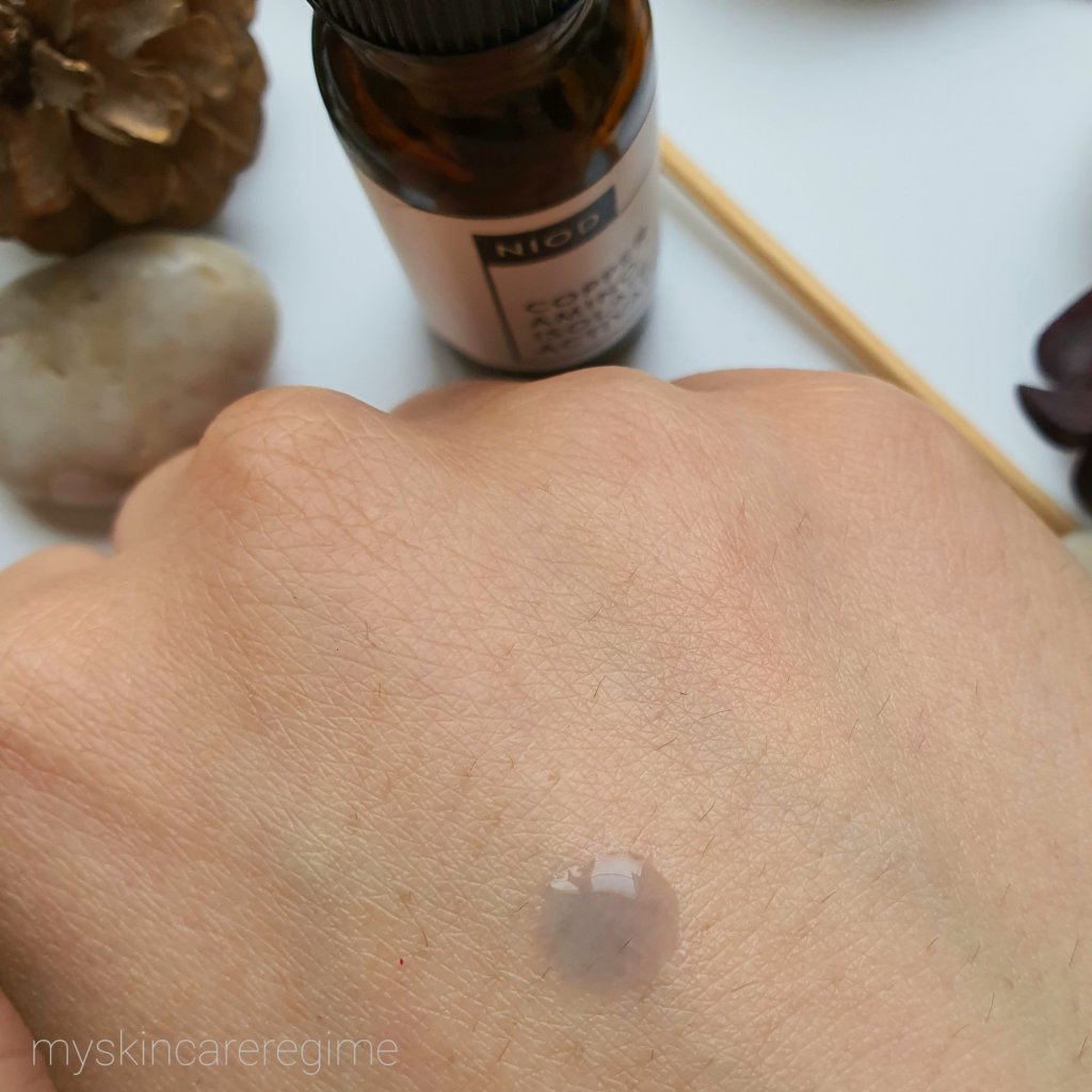 Directions: ”Apply to the face AM and PM” (I think you would run out very quickly this way since this serum is so watery and light). Niod state to apply this before applying any other skin treatments (I don’t know if this means even before toner as I would imagine it’s after toner?). Niod recommends adding their MMHC serum (review here) after, but I think you could use any other HA serum.