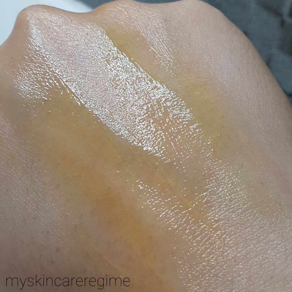 You can see the bright yellow colour of the ‘liquid gold’. This is one pump’s worth of product. I use about 3 altogether for both the face and neck.