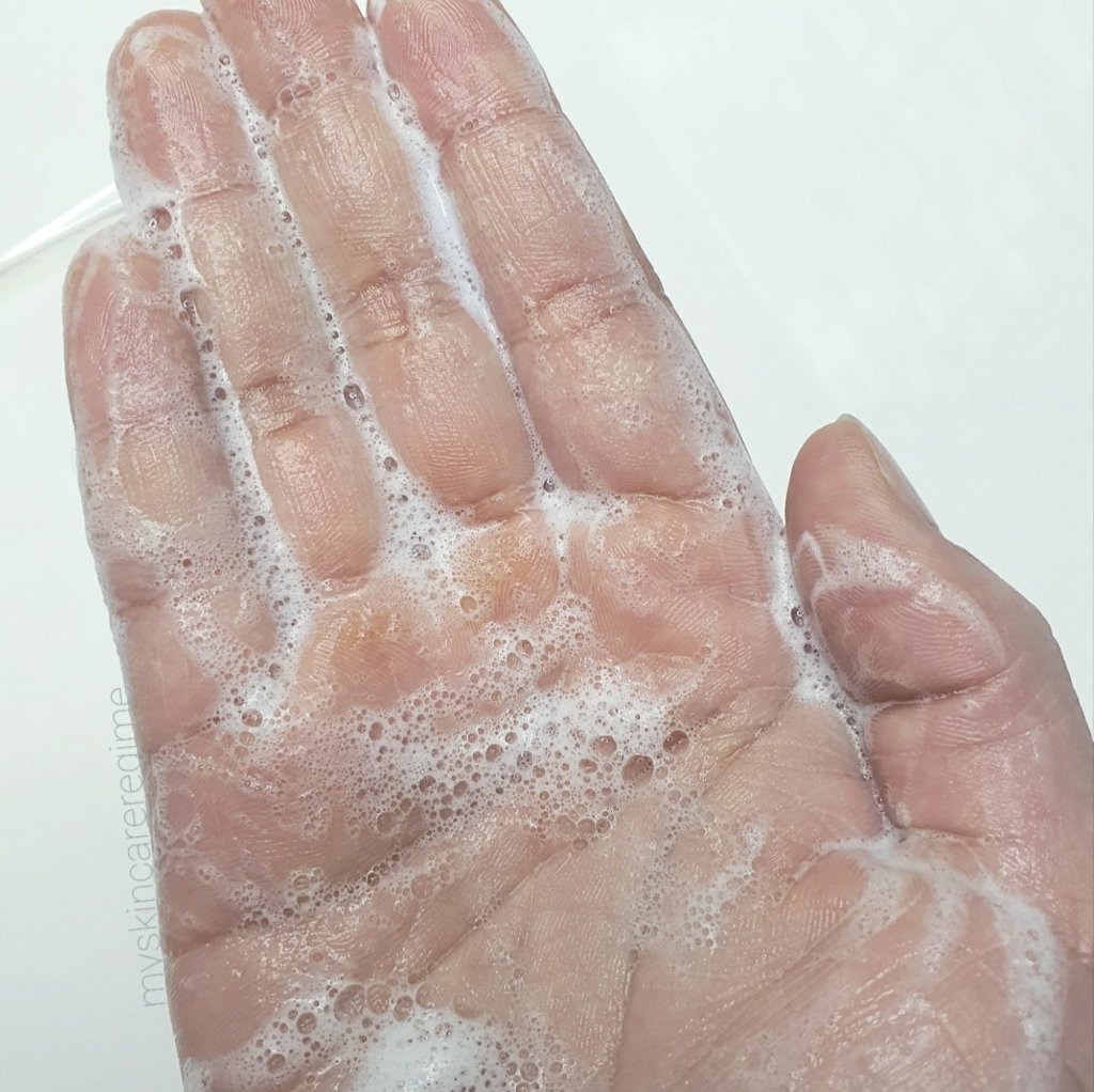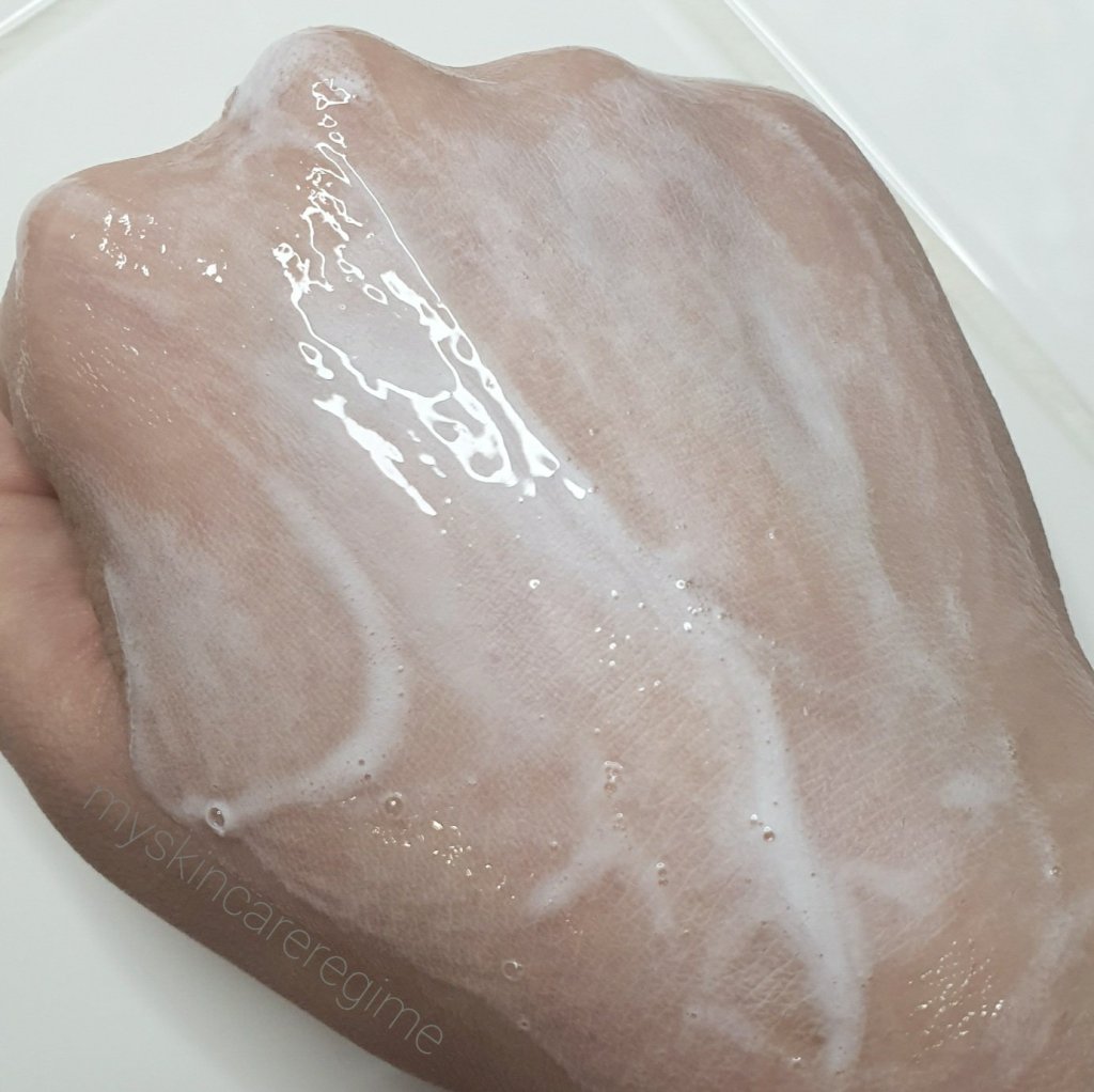 As you can see, this has a cream/jelly-like texture (i.e. it’s sticky and tacky before water is applied, then it foams up). No abrasive particles.