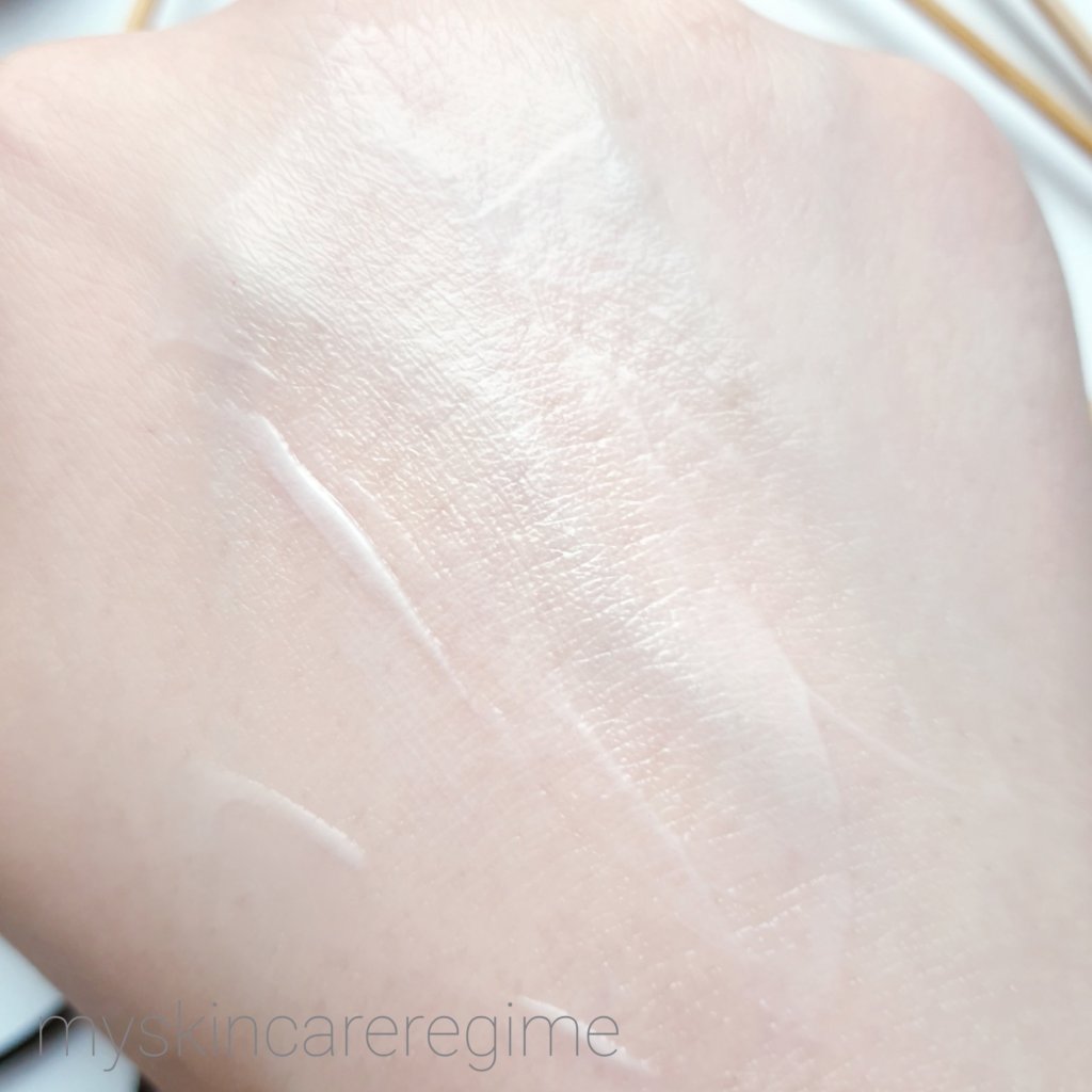 I can still feel it on top of the skin i.e. it doesn’t get fully absorbed or sucked into the skin like a lotion (which has more water), and immediately, it makes the skin feel smoother and softer. (I’m guessing it stems from these ingredients: Trisiloxane (This evaporates upon contact with the skin and makes it appear softer and smoother), Dimethicone, PEG-3 Dimethicone).