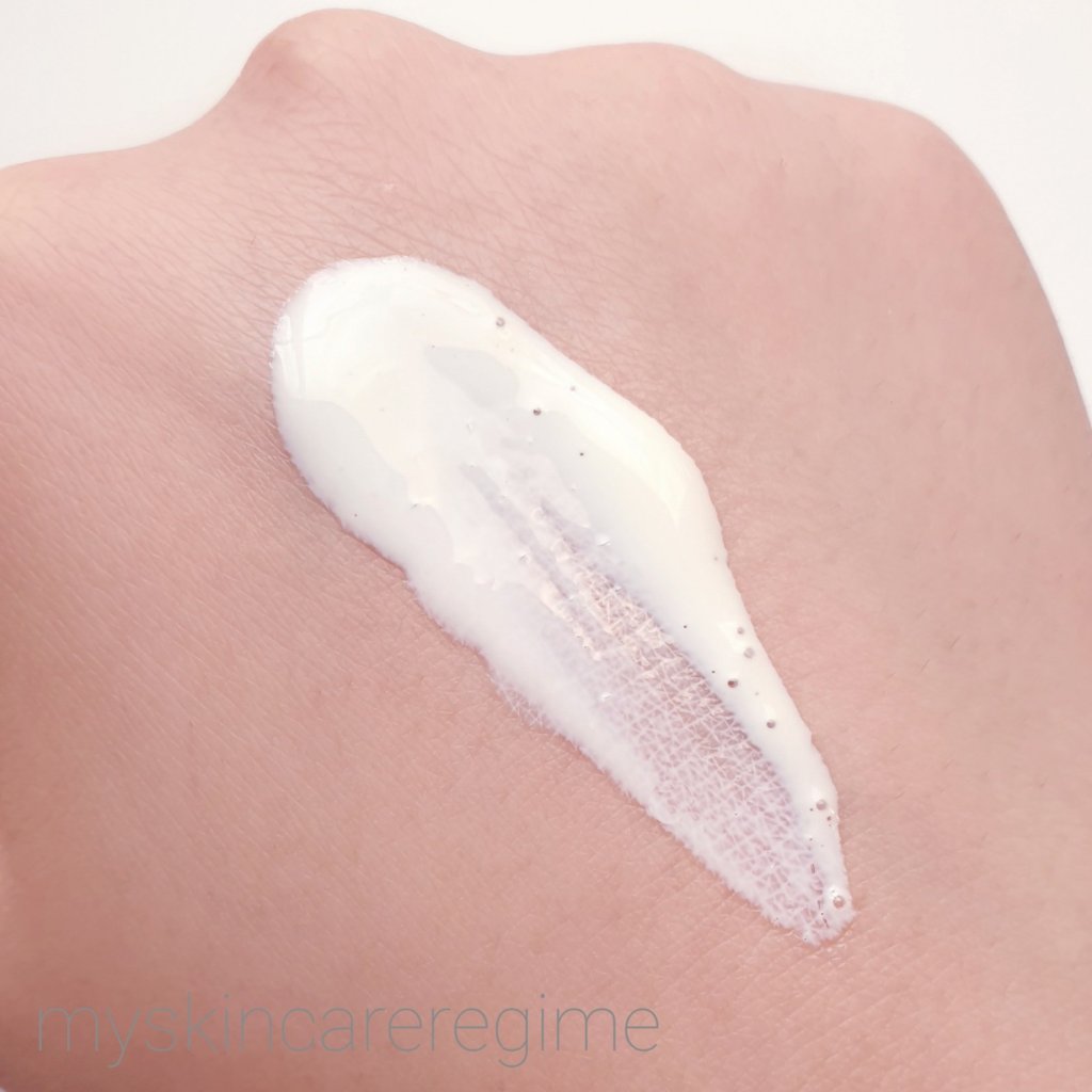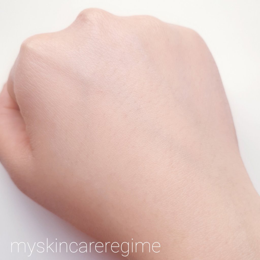 Texture: This comes out like a liquid that seems relatively lightweight as it slides along the skin. While rubbing in, I’m really hit with the scent which I’m not a fan of (smells like babies nappies, that sort of artificial scent). The more I rub in, the more emollient and greasy this starts to feel, and I realise that hair and/or dust is probably going to stick to my hand so I need to really wait for this to dry down/absorb. But that doesn’t mean that this mattifies or that oily/greasy feeling disappears, it’s more like I’m forced to get used to it.