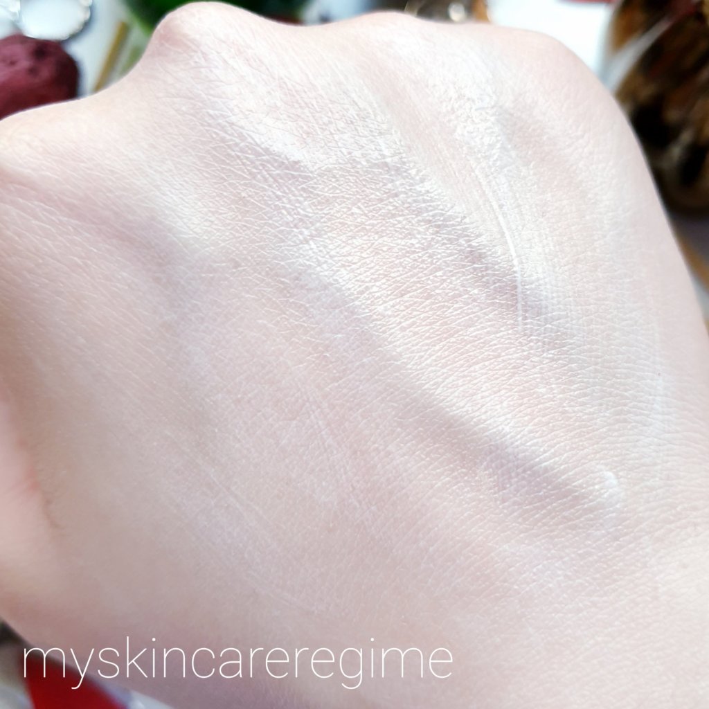 Texture: This definitely lightweight and a fluid (See video + Swatches below). This is probably the thinnest western SPF I’ve tried, as the La Roche-Posay Anthelios is slightly thicker (review HERE). This does not have a mattifying finish (not like the Missha Aqua Sun Gel or the Nivea Shine Control SPF) BUT, this is lightweight. It doesn’t ball or pill up either (not even under my mask, phew!). This does not feel sticky or tacky either and spreads easily. It doesn’t disappear totally into the skin as it provides a moisture to the skin which I appreciate. My issue is the slight grainy-ness I feel when applying. So I would highly recommend you shake this bottle firmly to minimise that grainy feel on application.