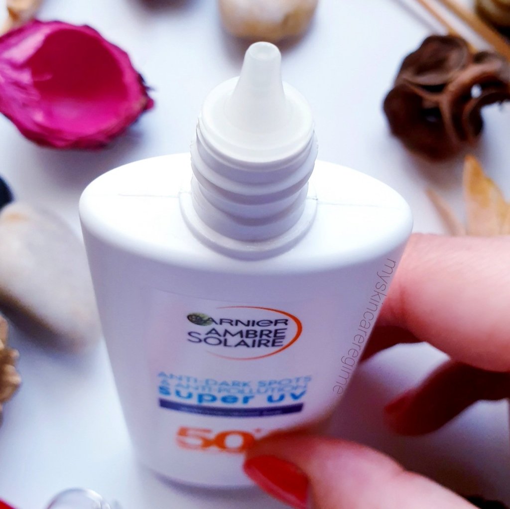 Brand Description: ” Garnier Ambre Solaire Anti-Dark Spots & Anti-Pollution Super UV Protection Fluid is enriched with hyaluronic acid and vitamin E. The ultra-light formula is absorbed instantly and offers daily hydration without leaving a greasy finish. Very high SPF protection to help prevent sun induced dark spots and protect against pollution induced oxidative stress.” (From the Garnier Website).