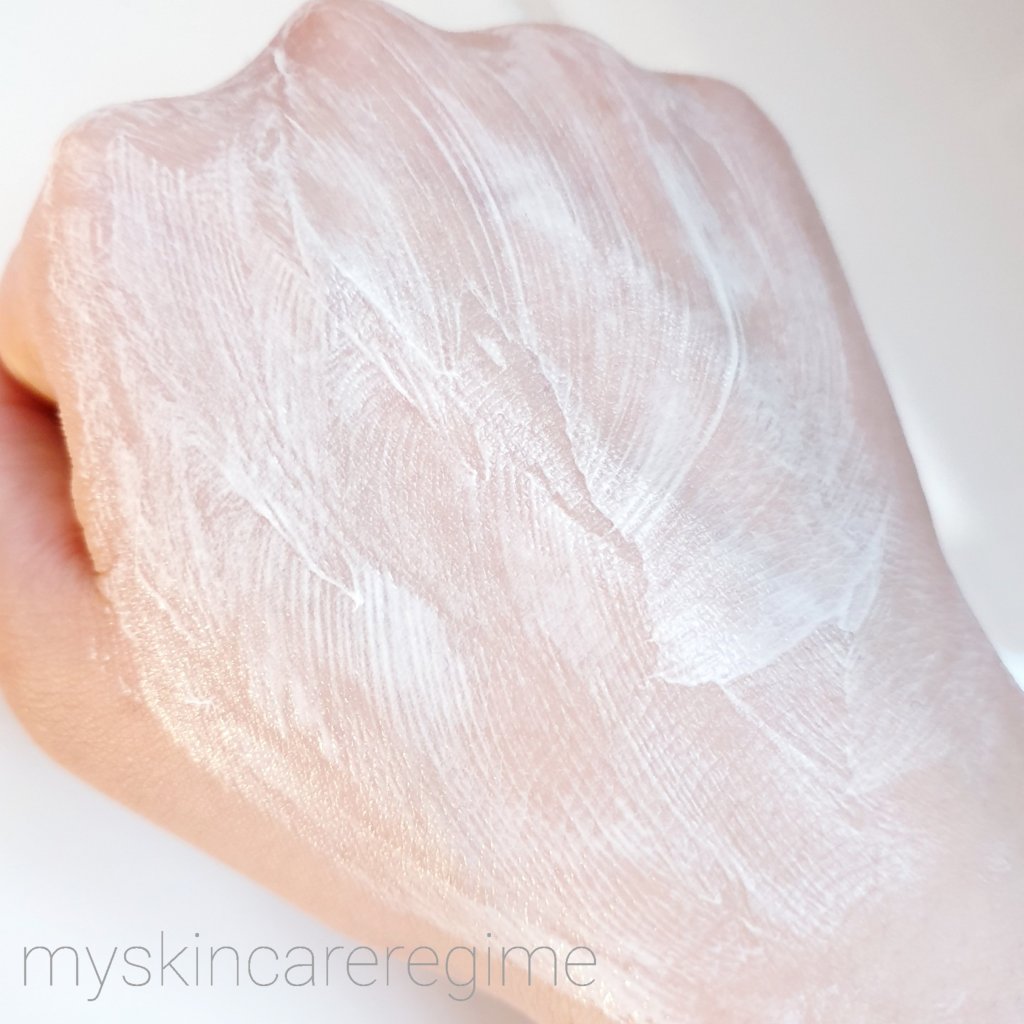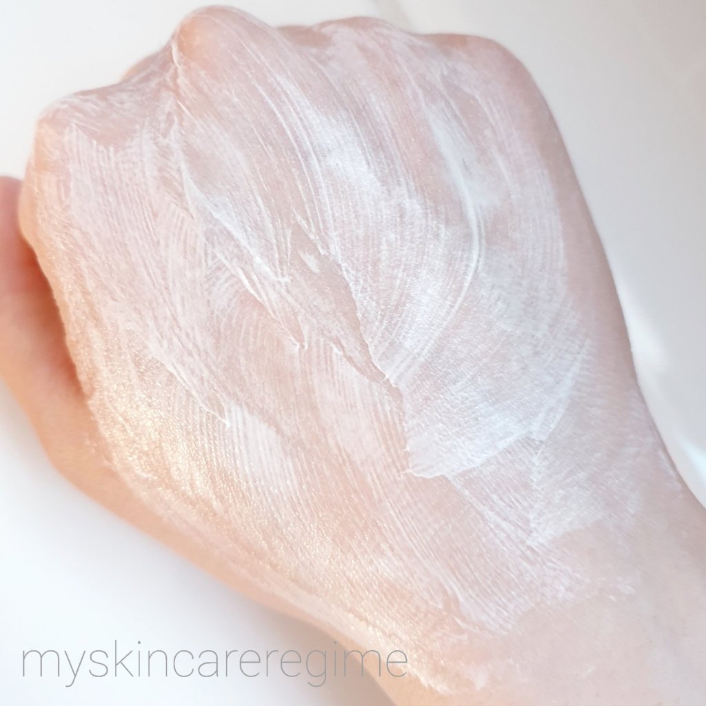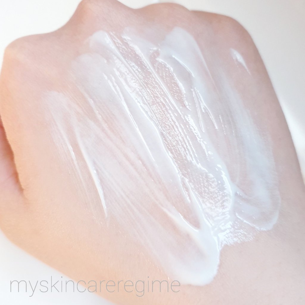 Texture: This has a creamy texture. It feels like a cream which does have a slight watery texture to it when initially applying. You feel that cooling sensation most definitely. It feels very soothing, almost like applying an aloe gel to the skin. But rubbing this in more and more, it begins to feel more uncomfortable, it forms more and more of an unbreathable barrier (great to prevent TEWL) which is why I’d say this would suit dry-er skins that need that protecting barrier.