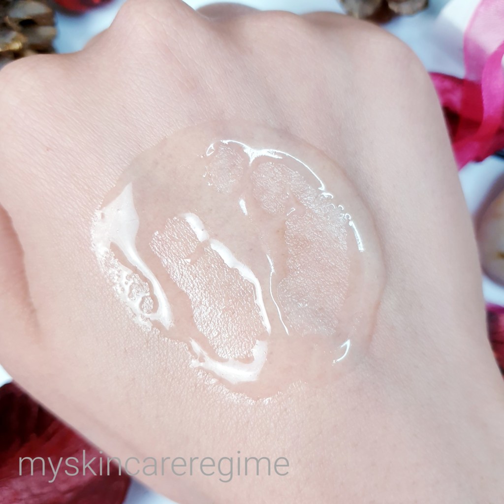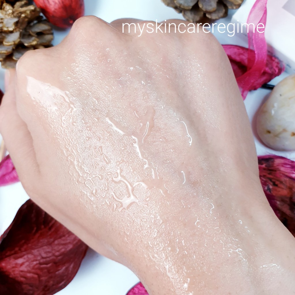 - As you can see, this is a lightweight watery->gel serum that forms droplets on the skin initially and is easy to massage into the skin. Once this dries down, it forms a thin film on the skin.