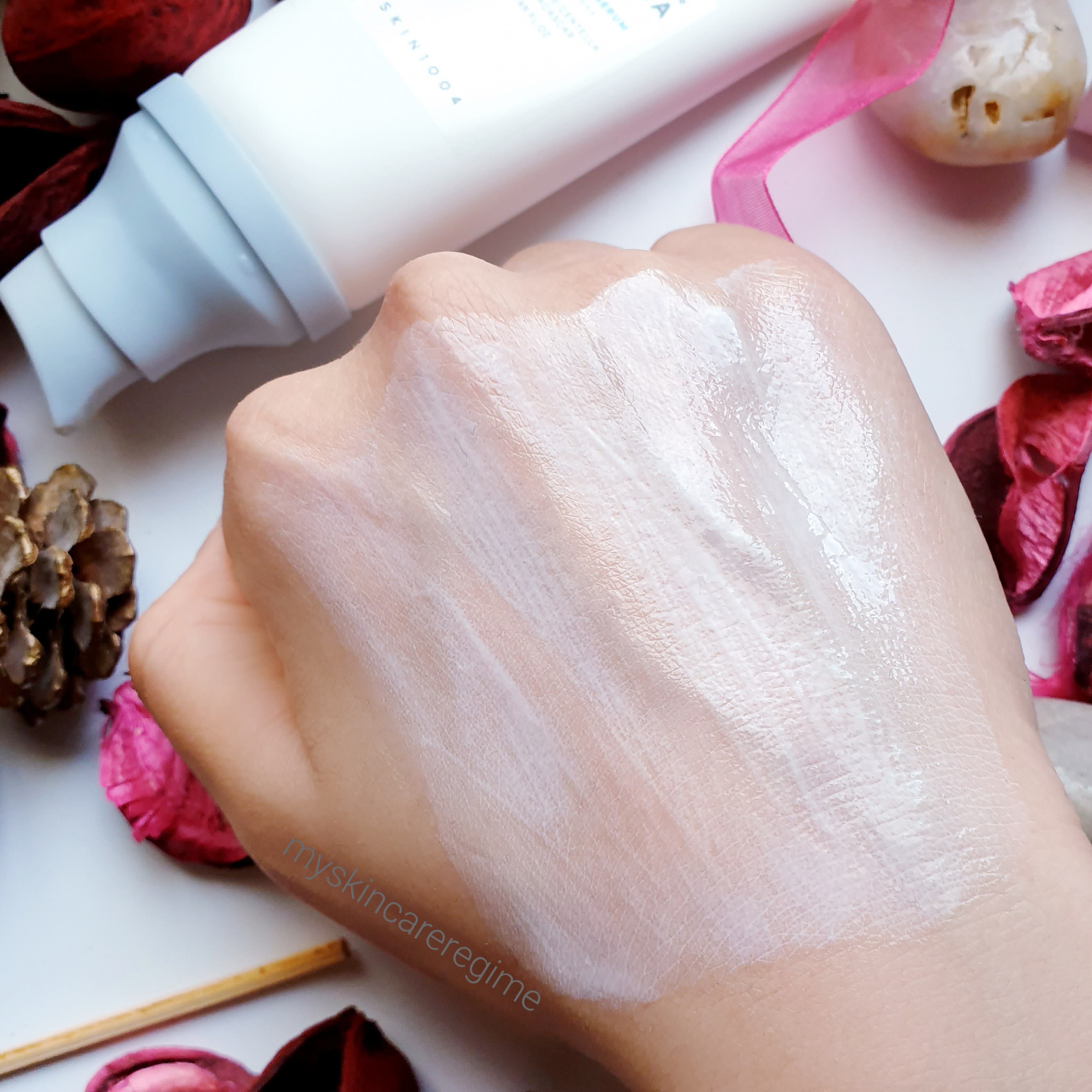 - This shine disappears once rubbed in (see below), but you can tell there are emollients and hydrating ingredients in here. You can also see that there is no white cast once rubbed in.