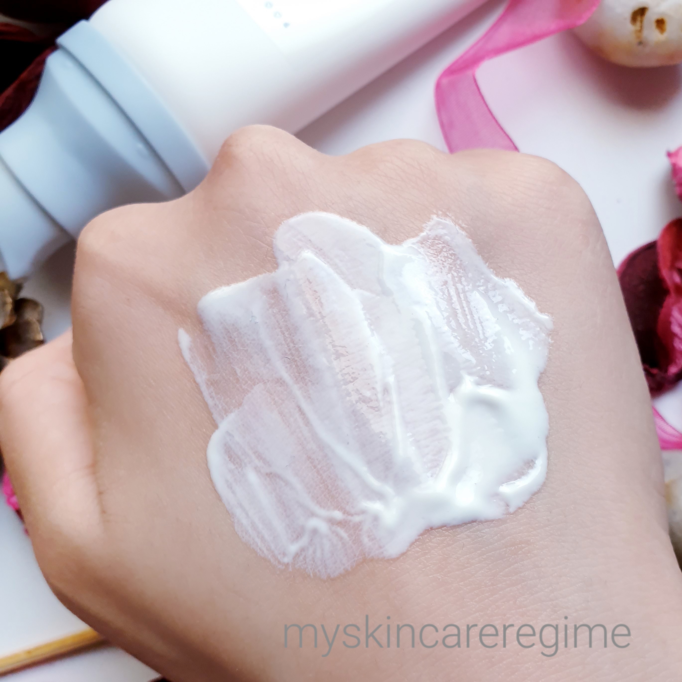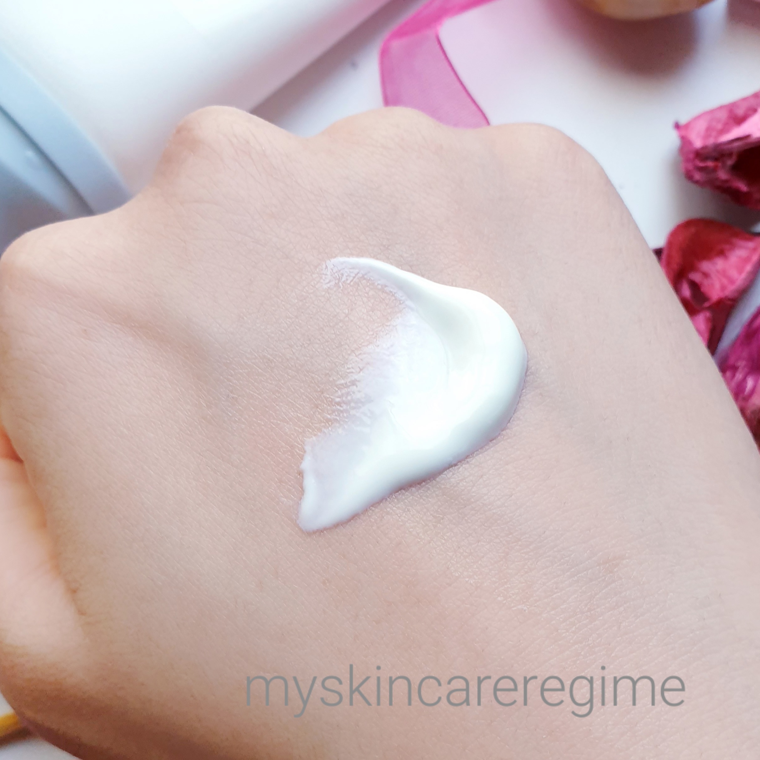 - As you can see this is initially an opaque cream before rubbing in. It spreads easily. By the way, this was one pump on the hand and it spreads quite far.