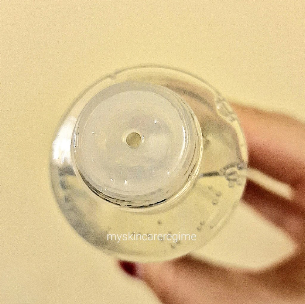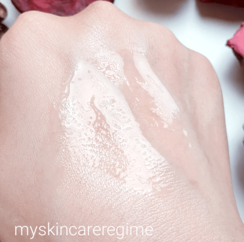 - As you can see this is a transparent liquid that when this spreads along the skin; it’s glossy and hydrating and doesn’t look thick BUT it almost looks oily. It’s not oily, but it almost feels it. That means this has some viscosity to it and an almost gloopiness, but it’s a pleasant and hydrating and soothing texture and feel on the skin.