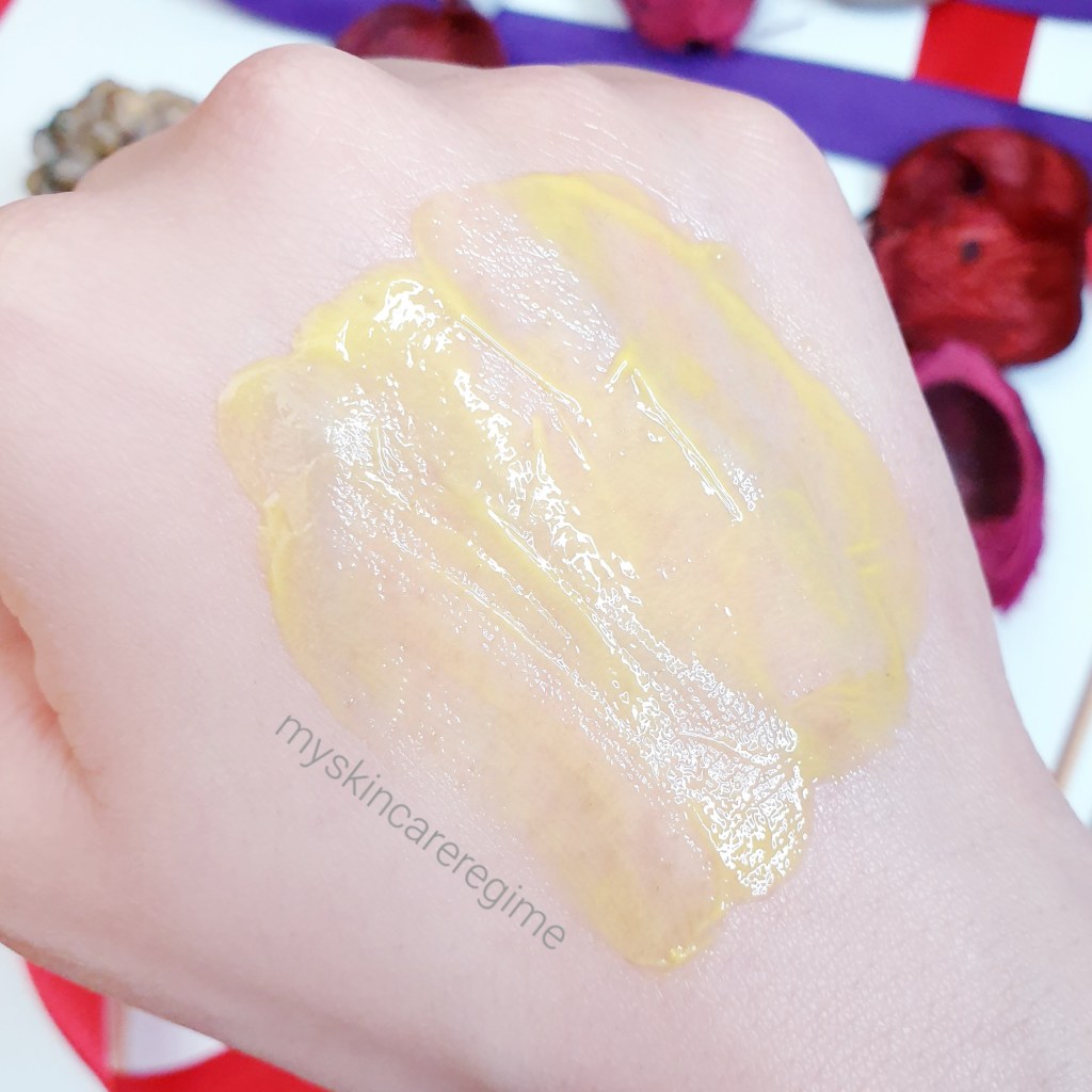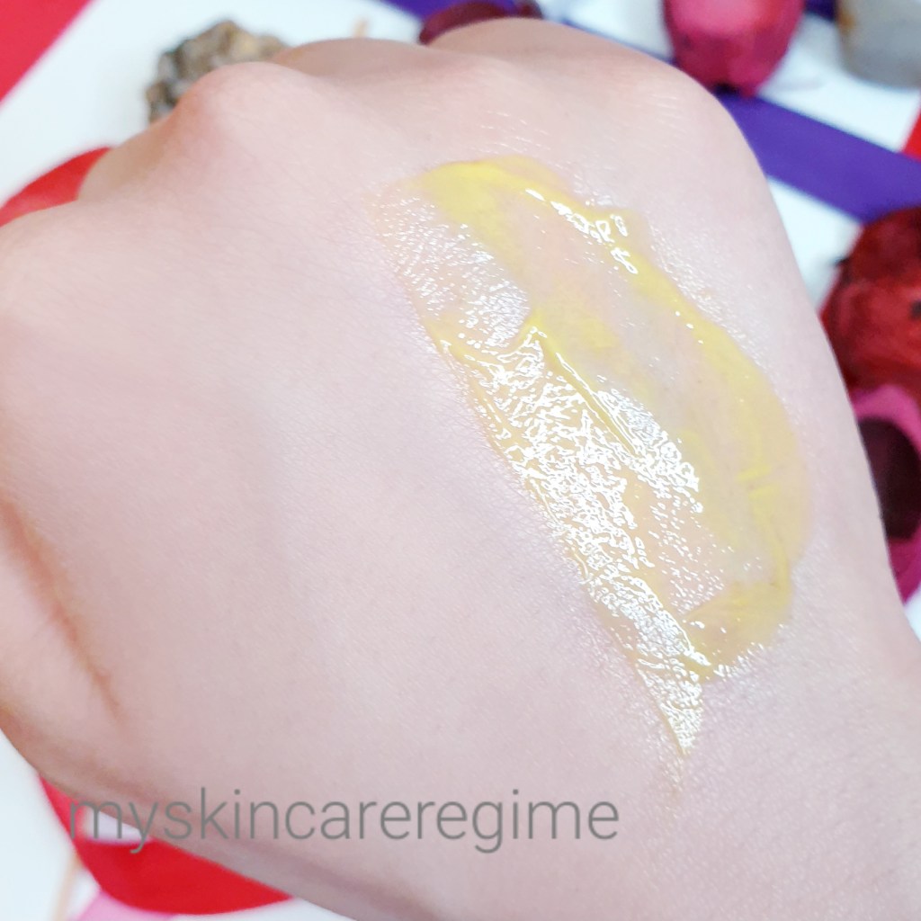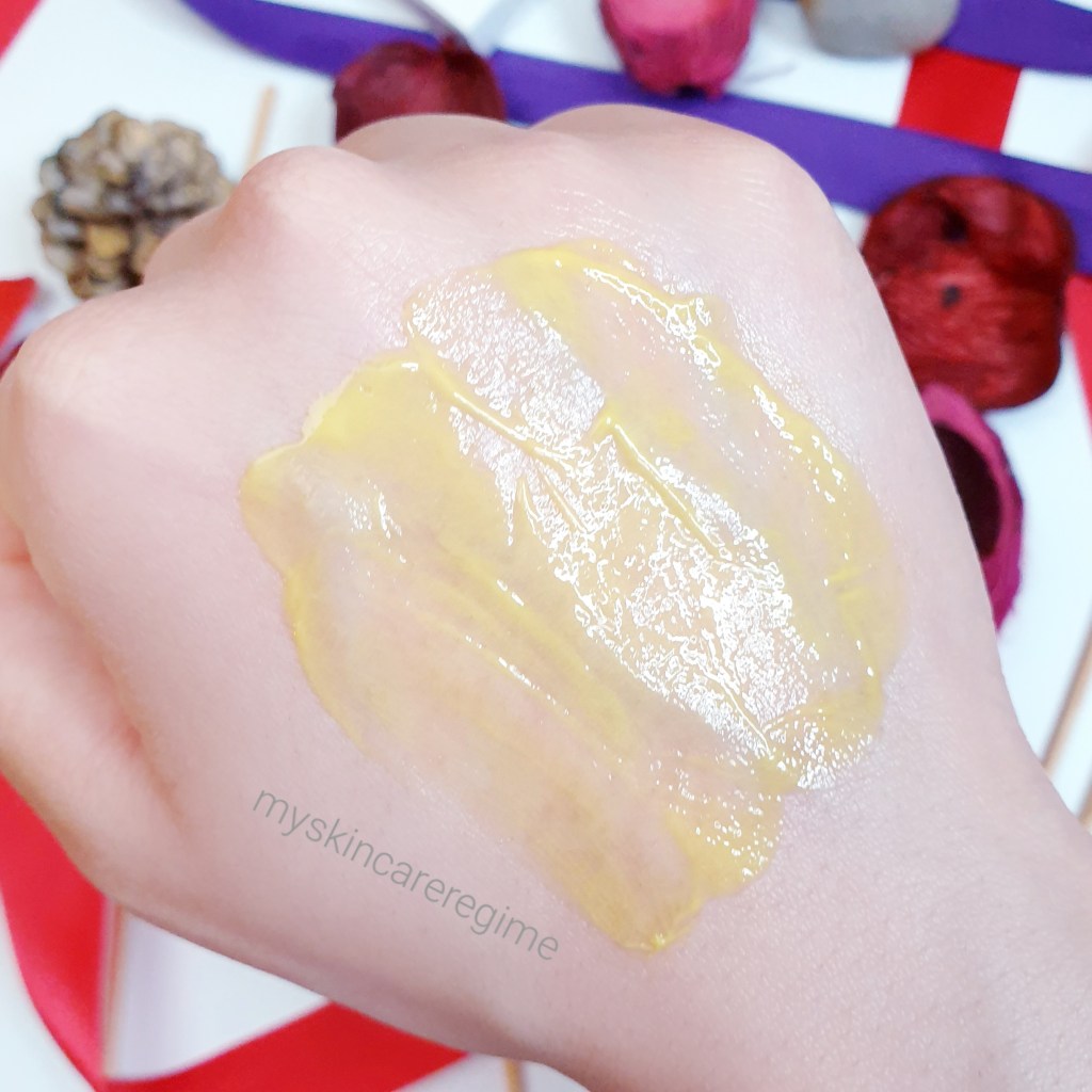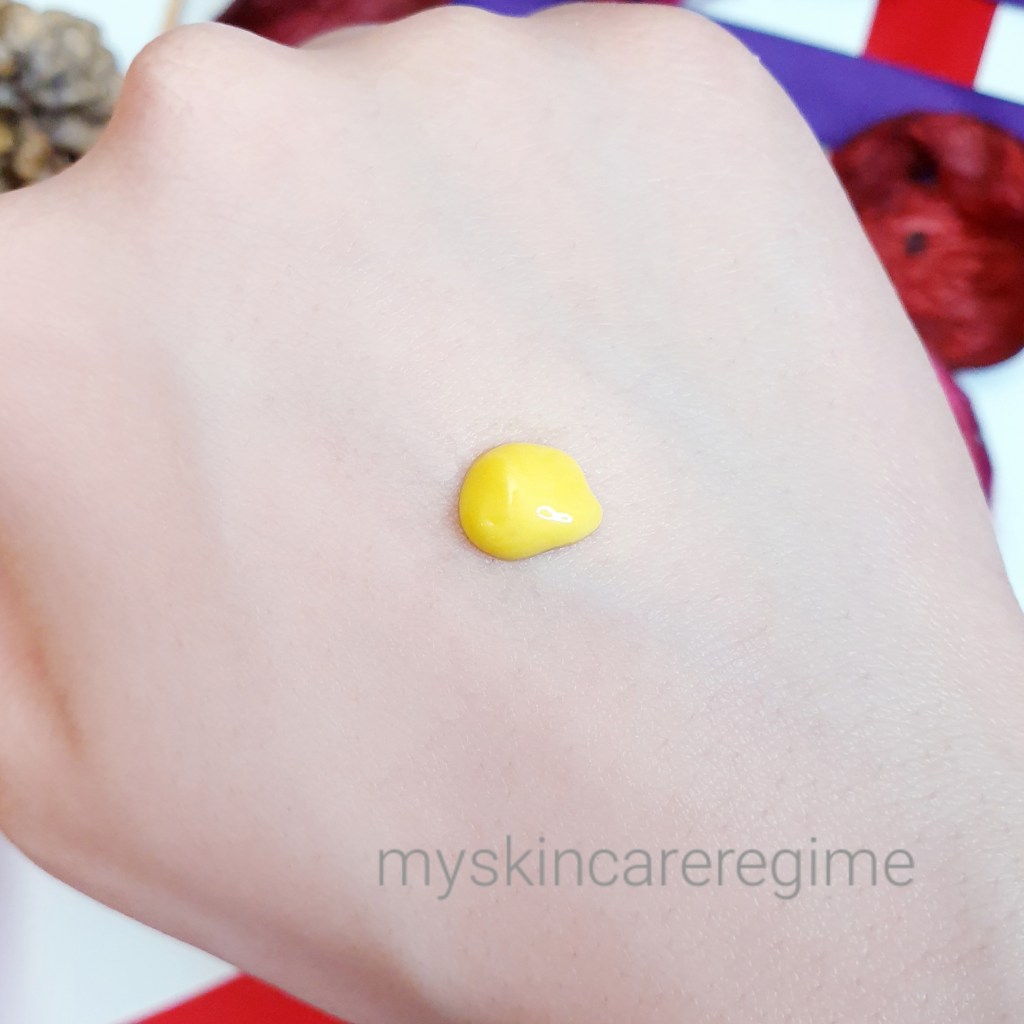 - As you can see, this is a bright yellow cream (serum) that smoothly spreads along the skin. It’s not sticky but does stain the skin slightly yellow and is moisturising. Hopefully you can see this is very emollient (almost oily-feeling) without being too thick.