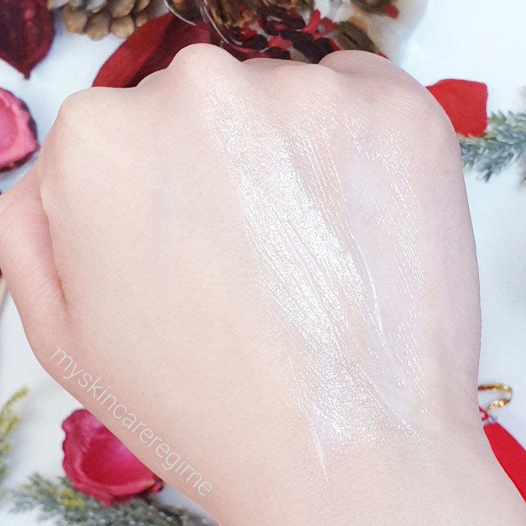 - As you can see, this has a lightweight texture. It will run down the hand if I tilt it. It does not feel sticky and feels hydrating (almost like a liquid cream but more watery than that).