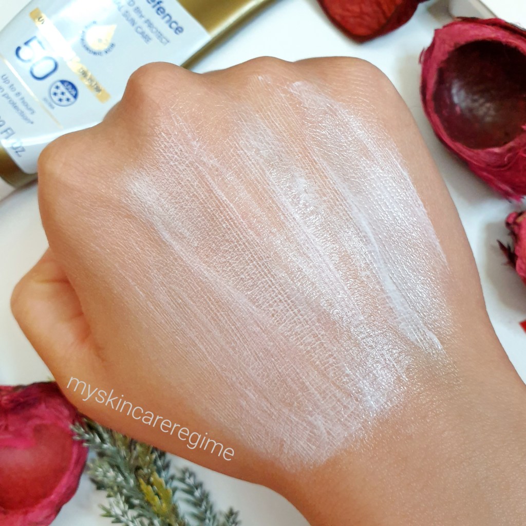 - As you can see, this is a creamy and lightweight SPF. It doesn’t look sticky or tacky. It definitely gives a glow to the skin, but does not give a white cast.
