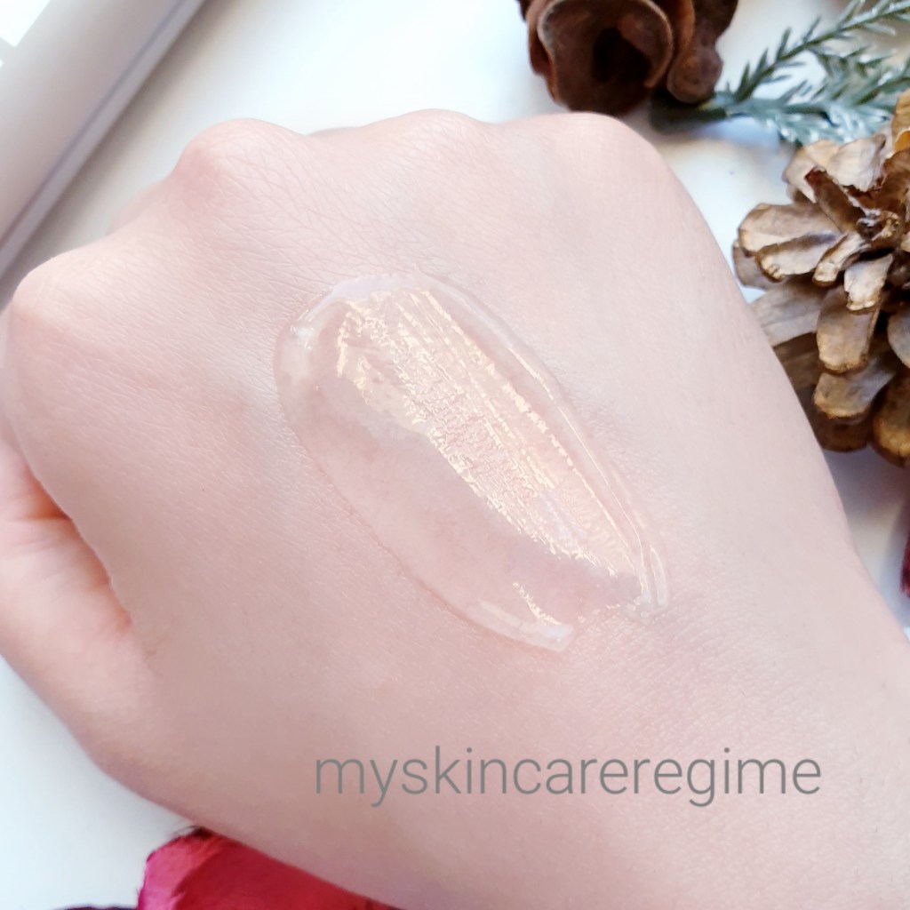 - As you can see, this is a transparent gel. It doesn’t look really water (i.e. it doesn’t just melt on top of my skin), I have to rub it in in order for it to absorb (doesn’t just slide down the hand, it has some adherance).