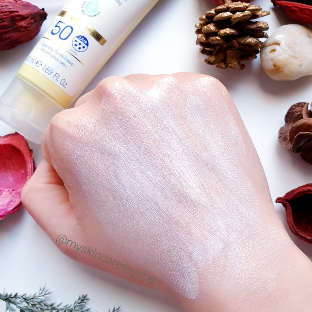 Texture: This has a lightweight, moisturising texture. It very much feels very similar to the Bondi Sands Moisturising Sun Lotion SPF50. It spreads far and is easy to rub into the skin but it doesn’t mattify or fully settle down, it constantly feels shiny and dewy on the skin. See the images and swatch video below to see this texture.