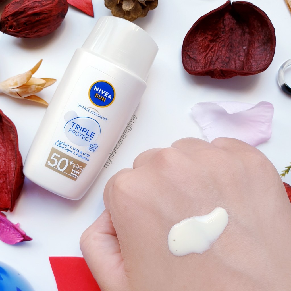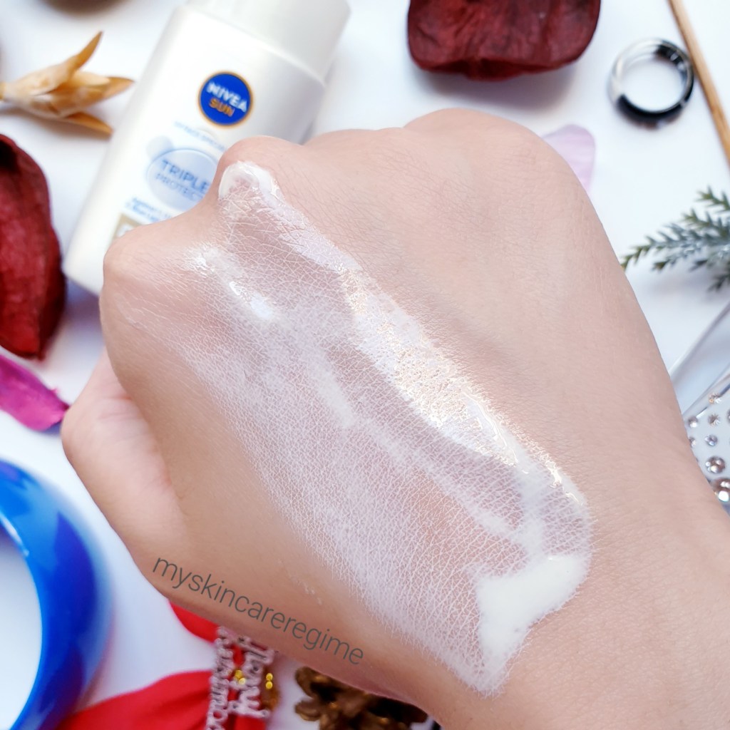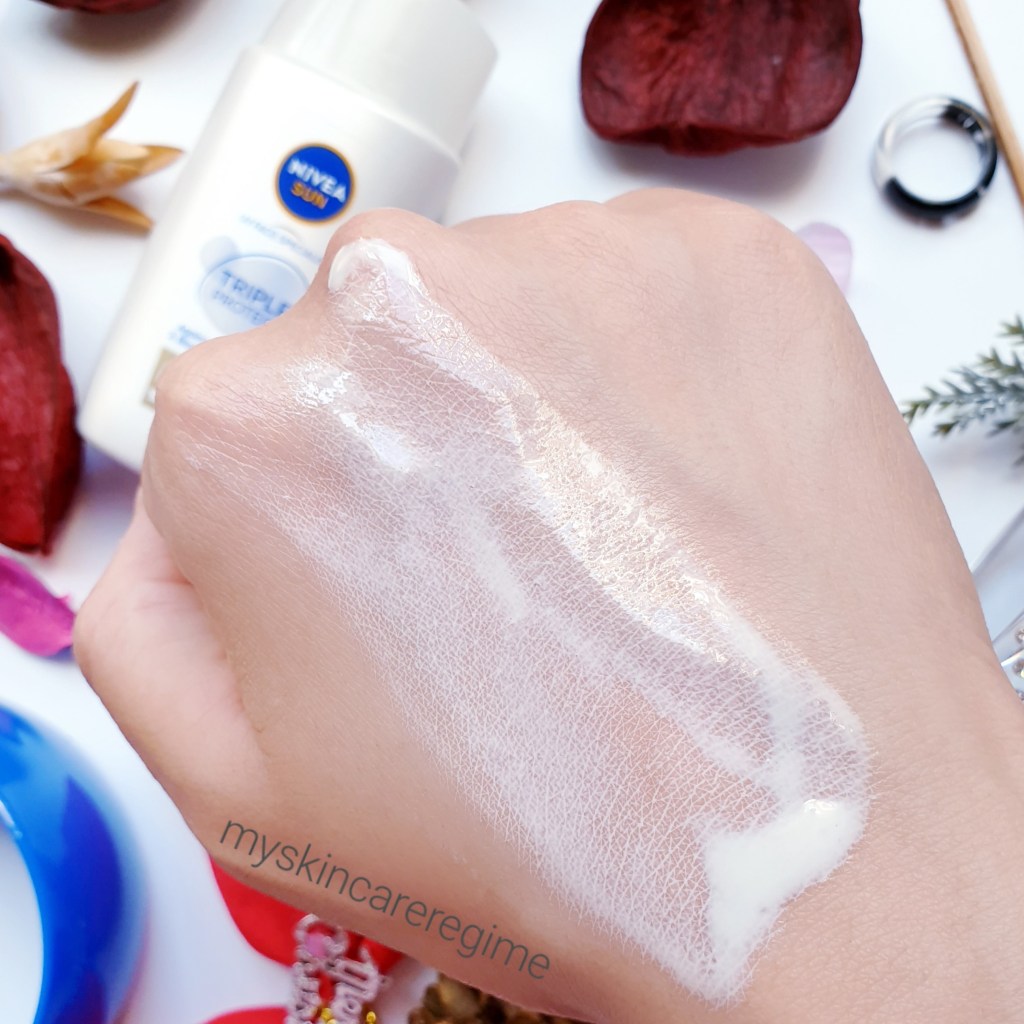 - As you can see, this is a liquid, lightweight and shiny SPF (hopefully you can see the white cast). It doesn’t fully dry down/absorb and feels greasy on the skin. This is not sticky or tacky however.