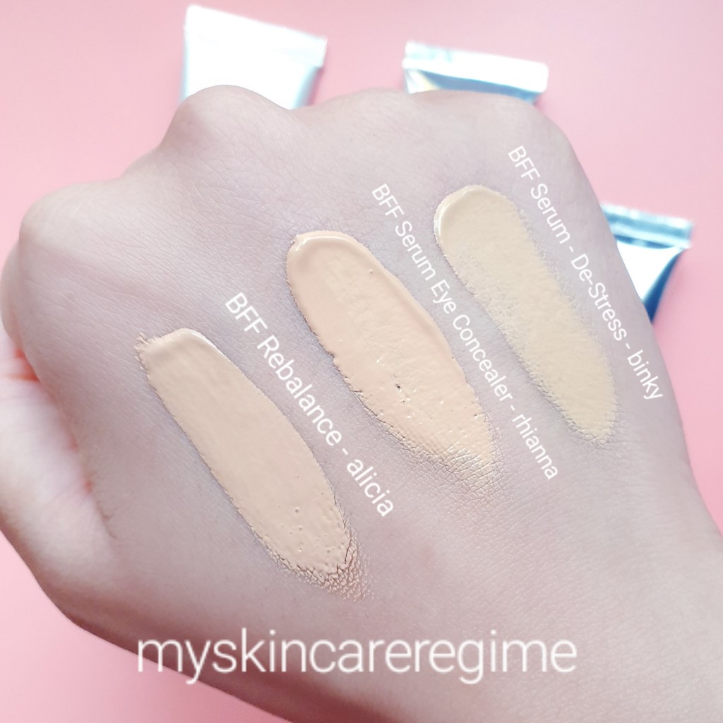 What’s the difference between BFF De-stress VS BFF Rebalance?: De-Stress is aimed at Normal/Dry Skins and has a Low-medium, buildable and Glowy Finish. Whereas BFF Rebalance is aimed at Oily / Combination / Blemish-prone Skin with a Medium, Buildable Coverage (aims to not be so shiny).
