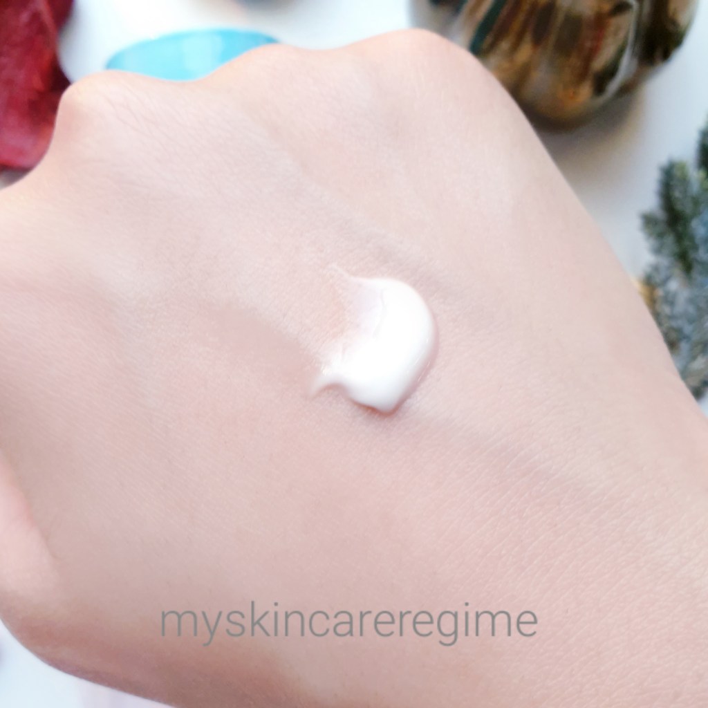 Texture: This has a typical cream texture. This is emollient and isn’t sticky or tacky (doesn’t ball up). This is quite thick, however for my oily-combination skin. It almost has a ”suffocating” feeling on top of the skin and has a creamy residue on top of the skin for me.