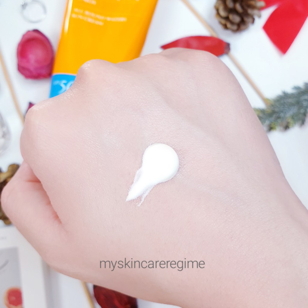 Texture: This is a creamy, lightweight sunblock that instantly feels hydrating while rubbing in. I’m surprised by how lightweight it is, and it means that this spreads very far (make sure you still apply the appropriate amount of sunblock). It doesn’t make my skin feel like it’s suffocating or uncomfortable. However this is NOT a mattifying sunblock. It does have a dewy finish (great for dry skins and dehydrated skins or those in dry/cold weather), so I could imagine oilier skins finding the finish of this to be uncomfortable as this does not disappear into the skin. Yes, it gets absorbed and settles, (doesn’t move around all over the face), but you do have a glowy appearance (I don’t look horribly shiny/greasy or sweaty, but I look glowy).