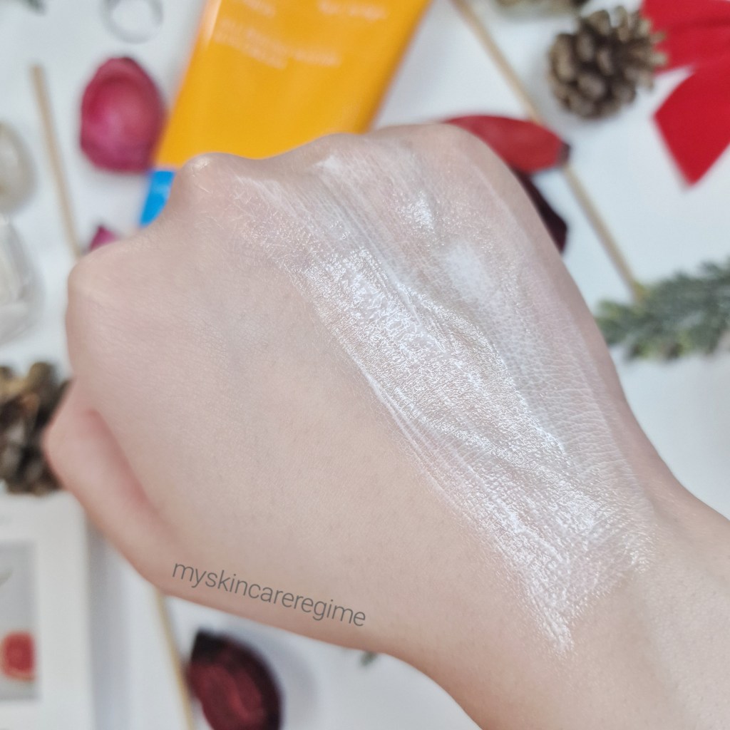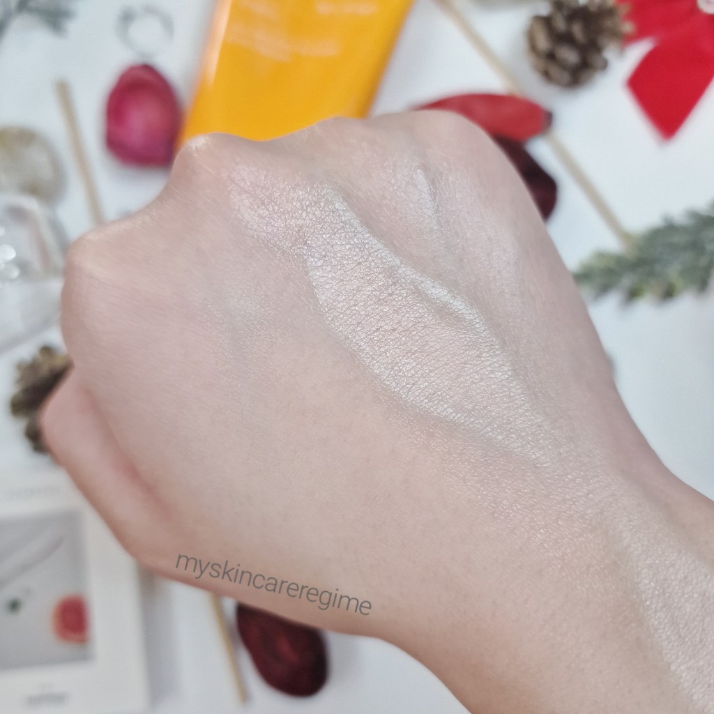 - As you can see, this has a lightweight cream texture and isn’t sticky or gloopy. It does have a shiny/dewy finish (but this doesn’t make me look very badly greasy looking).