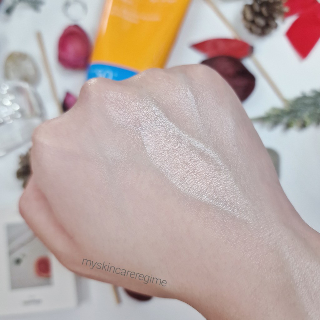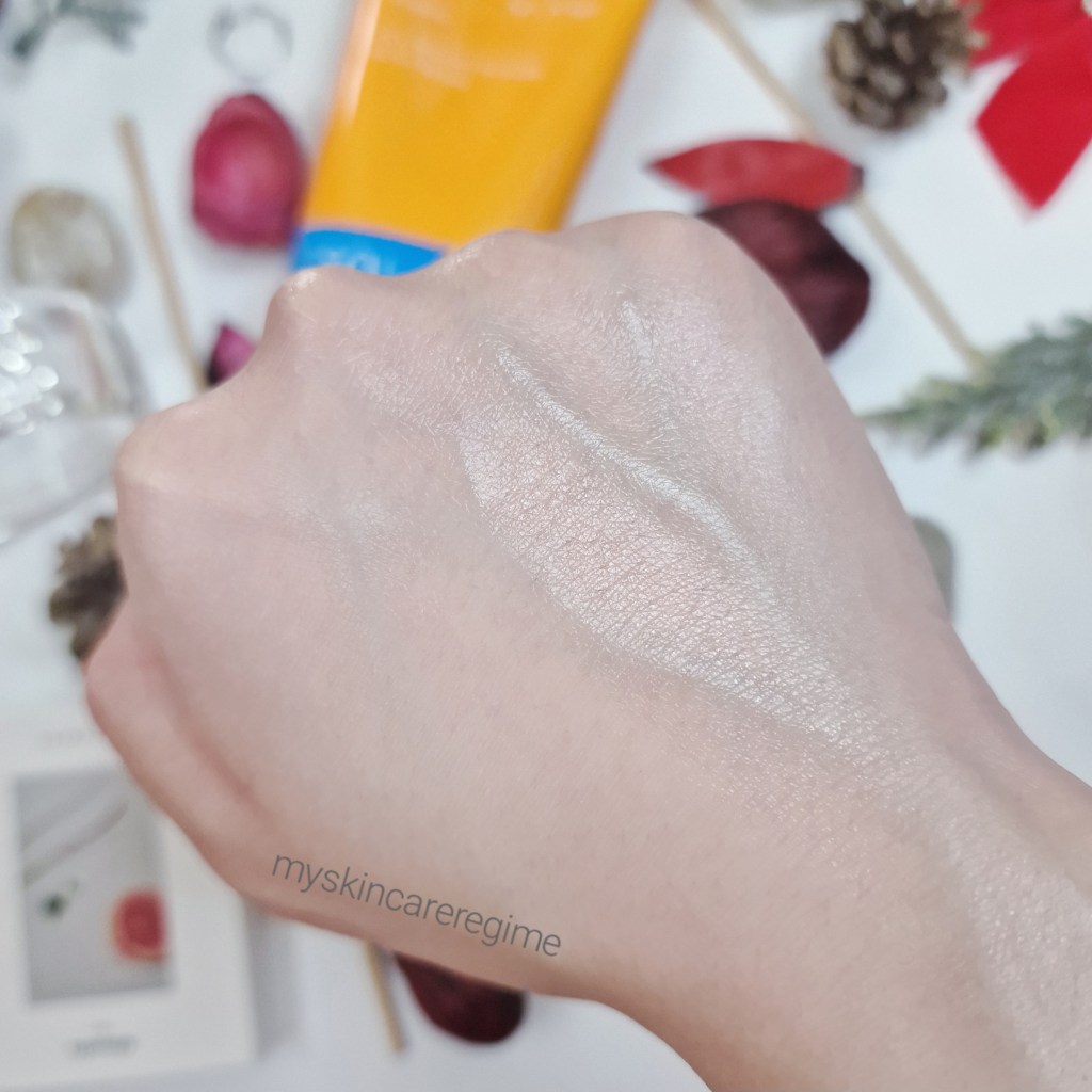 - As you can see, this has a dewy finish to it. This is not a mattifying sunblock. (But this isn’t horrifically shiny on my face).