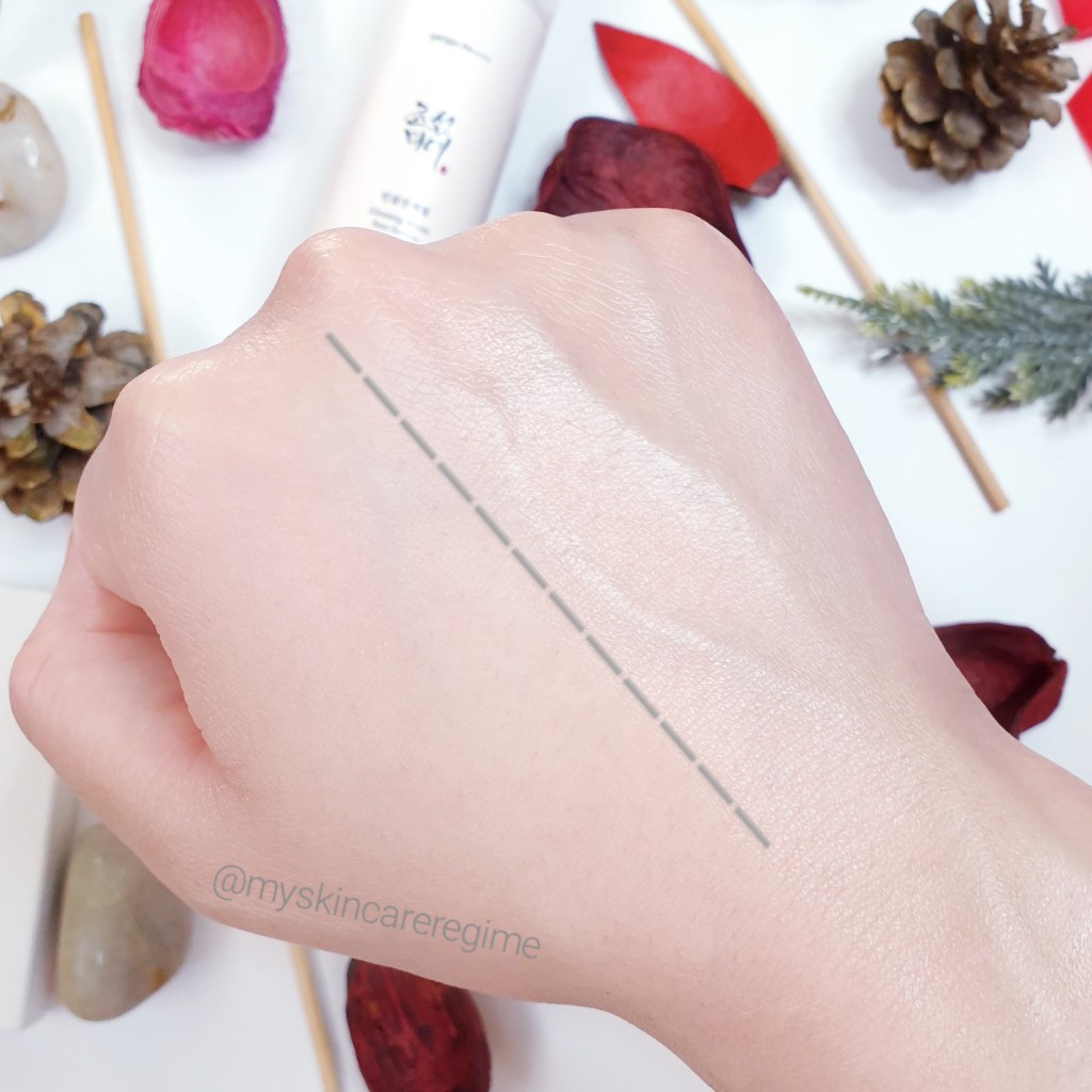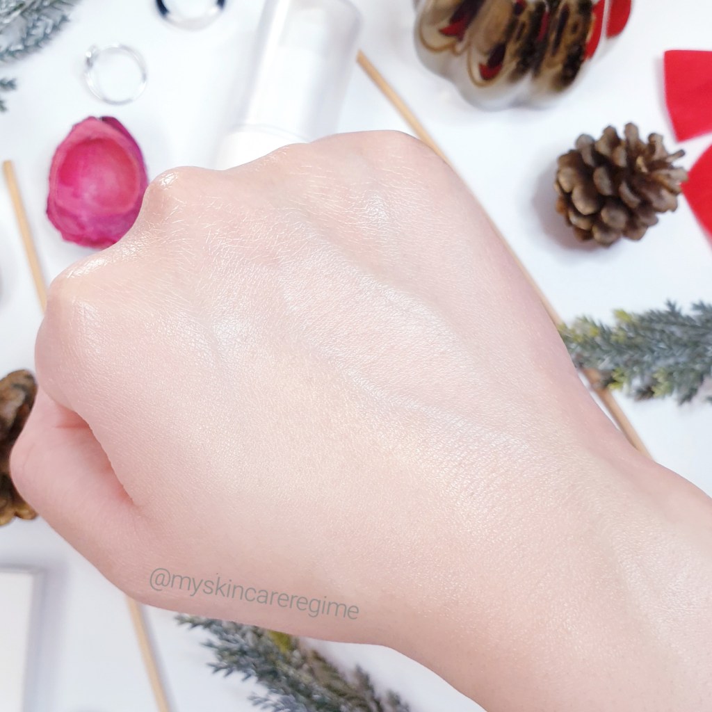 Texture: When applying, this has a slight cooling feeling (I’m guessing it’s the alcohol) but it does also feel moisturising (to my oily-combination skin). This has a yellow-ish tint to it when squirting out of the bottle. It has a gel (silicone-based) texture and is very smooth and lightweight when applying onto the skin (not bumpy like the Goodal silicone-based Sunblock). This doesn’t totally vanish into my skin once disappeared, but it’s close! Close enough that this product doesn’t ball up or feel heavy on the skin. My skin still feels like it can breath (See the Swatch Video Below).