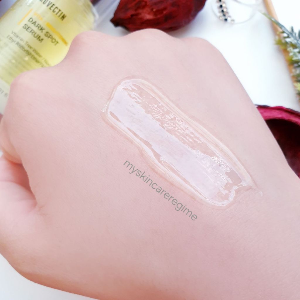 - As you can see, this is a gel serum that isn’t sticky or tacky and glides along the skin (and absorbs) well. The yellow tint it has does NOT tint the skin.