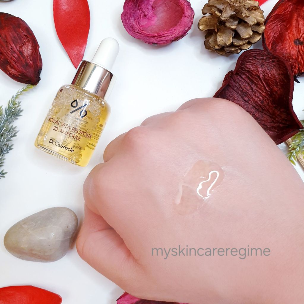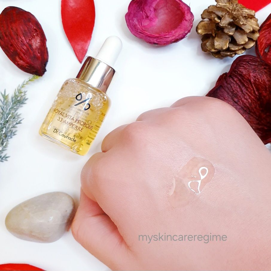 Texture: This has a lightweight, almost watery texture to it. Propolis has a distinct feel and this ampoule has that. It’s lightweight and fast absorbing and spreads easily along the skin.