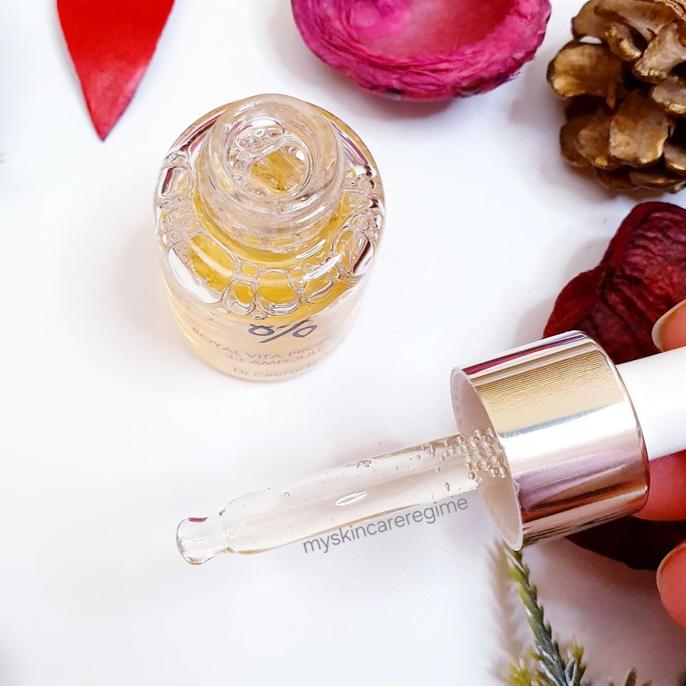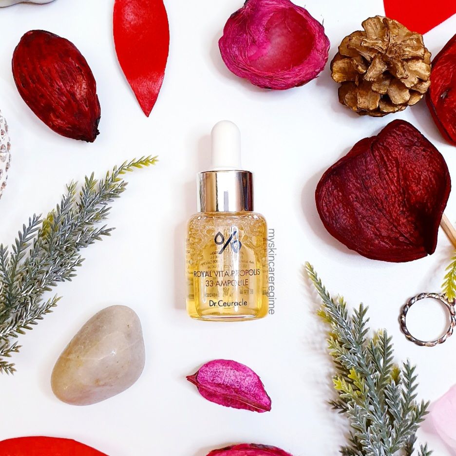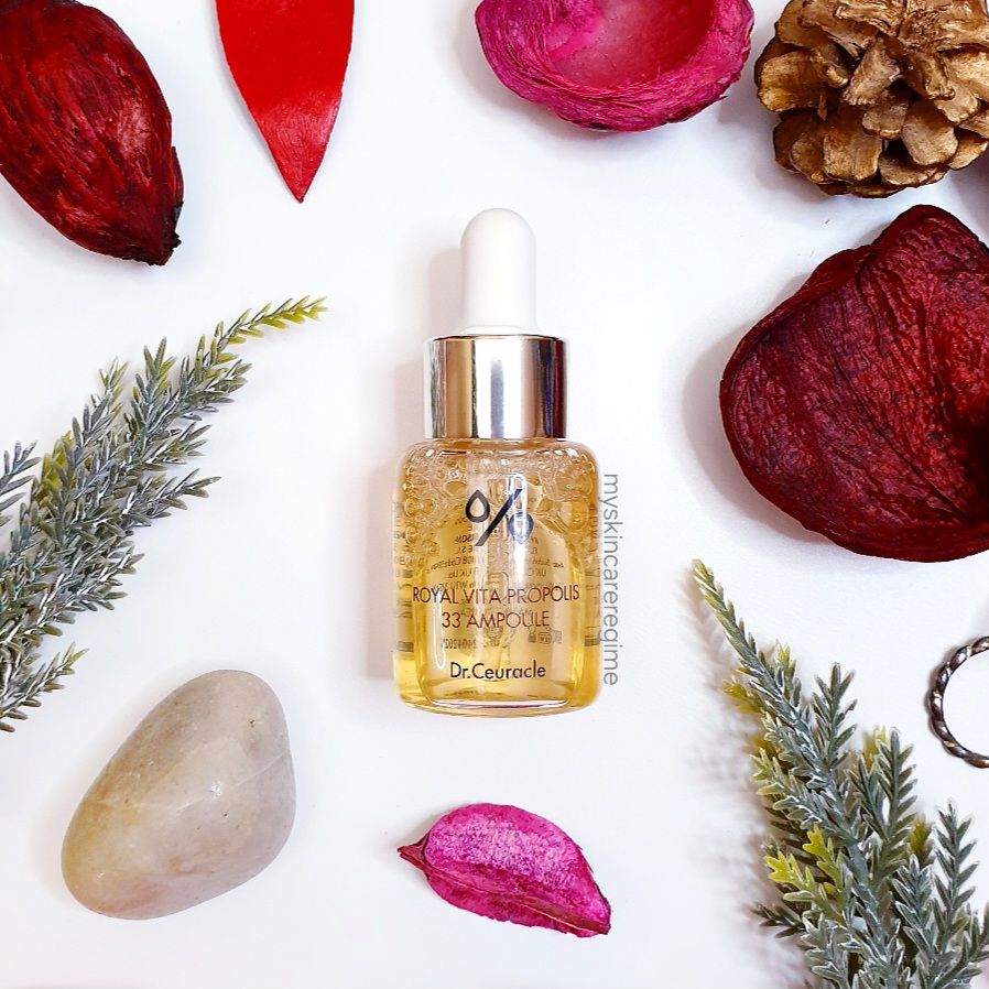 What is it + What does it do?: An ampoule containing Propolis + Royal Jelly + Vitamin C + Rose water+ Niacinamide + Panthenol + Ethyl Ascorbyl Ether (A Vitamin C Derivative) to relive irritated / sensitive skin, brighten and protect the skin, keeping it hydrated and conditioned.