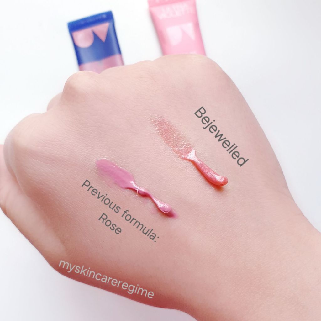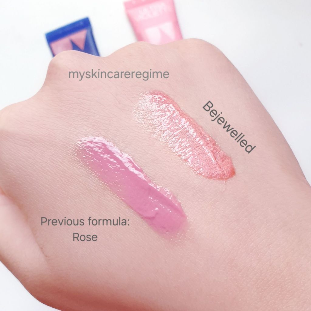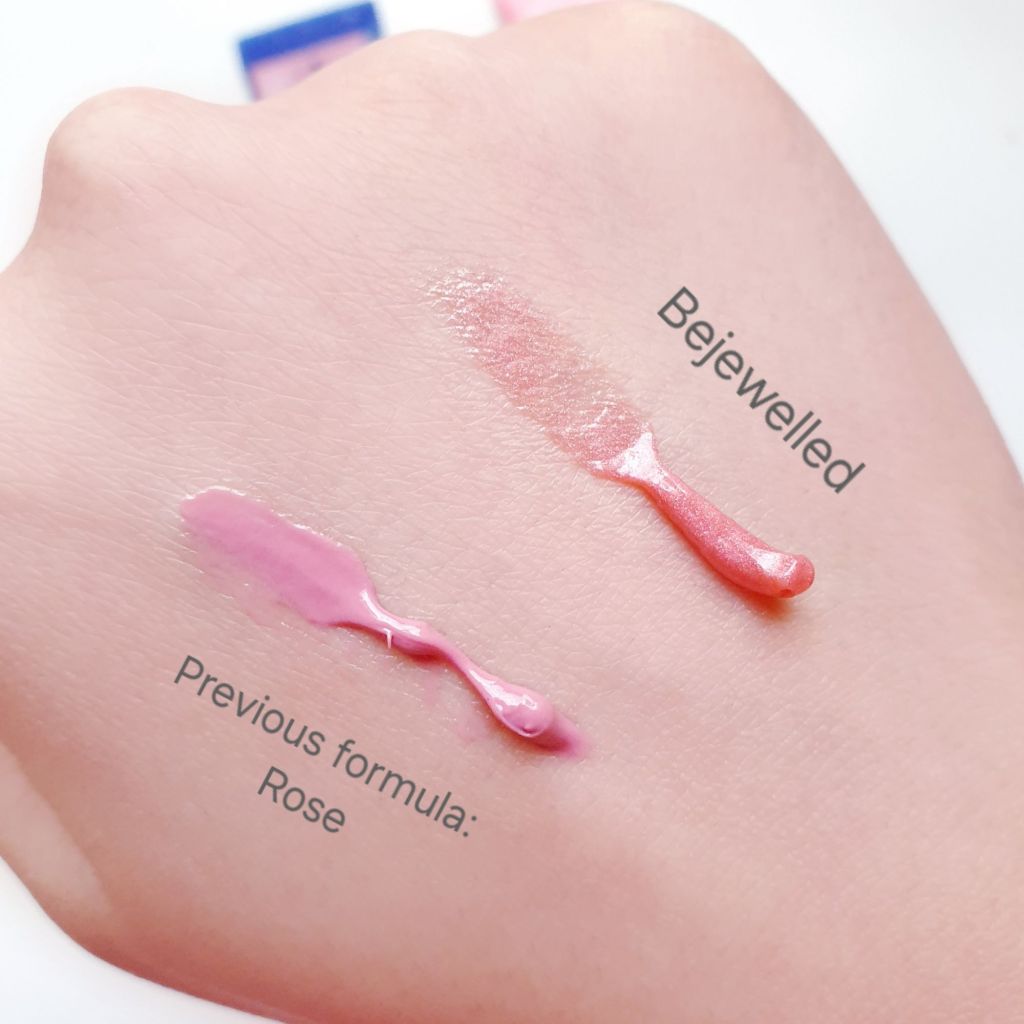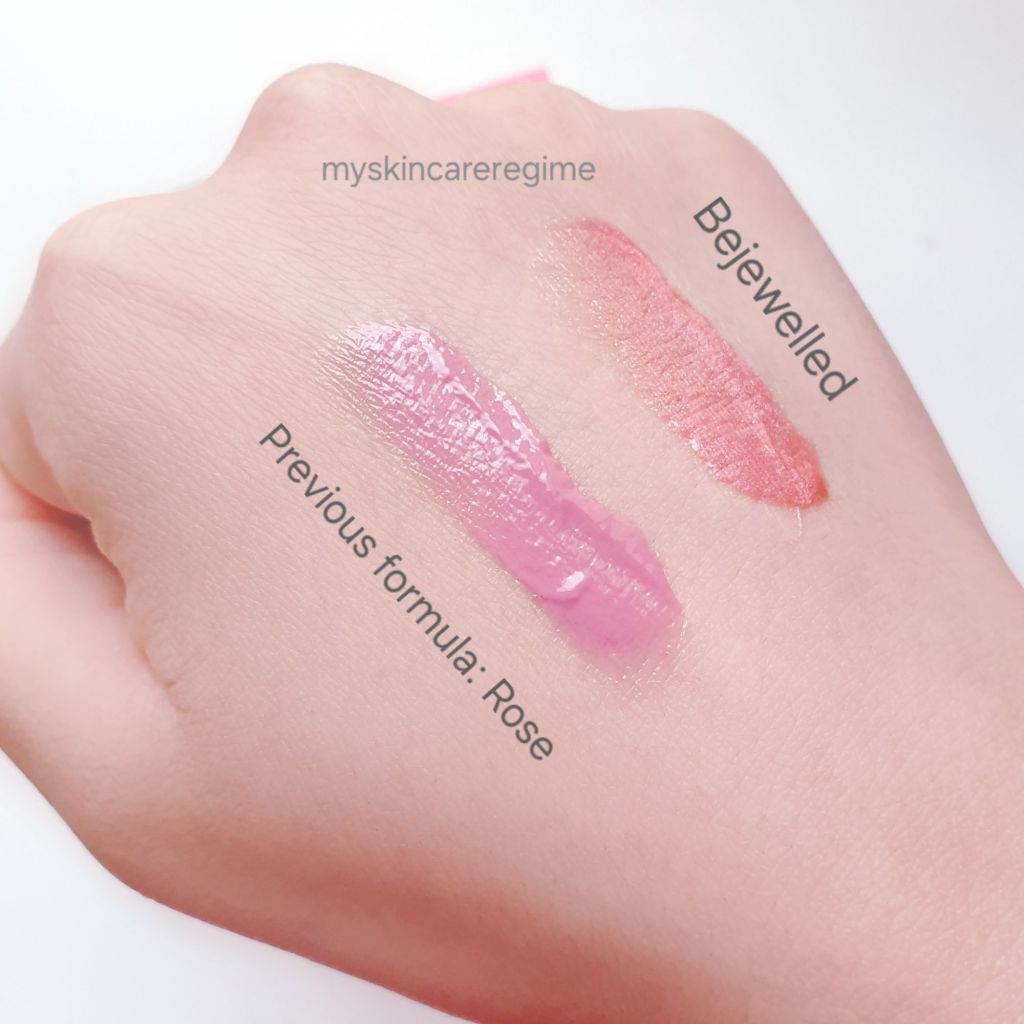 The new formula’s texture is very similar to the previous formula. This new formula melts into the lips, is easy to rub along the lips, it’s smooth, glossy and moisturising. It does not feel sticky. It is actually very similar to the Pixi Collagen Lip Gloss in terms of its texture and wearability.
