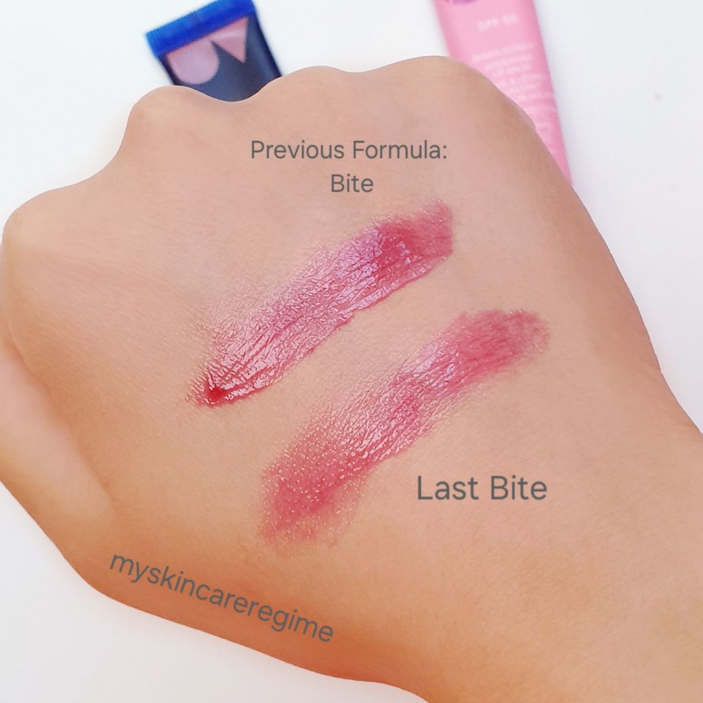 As you can see, Silk Pillow is the most transparent. These look a lot more saturated on the hand compared to when applied on the lips. You would need to apply a lot of product on the lips in order to get this kind of colour payoff (please see the lip swatches to see what I am talking about. The most saturated is Last Bite, however Smoothie too.