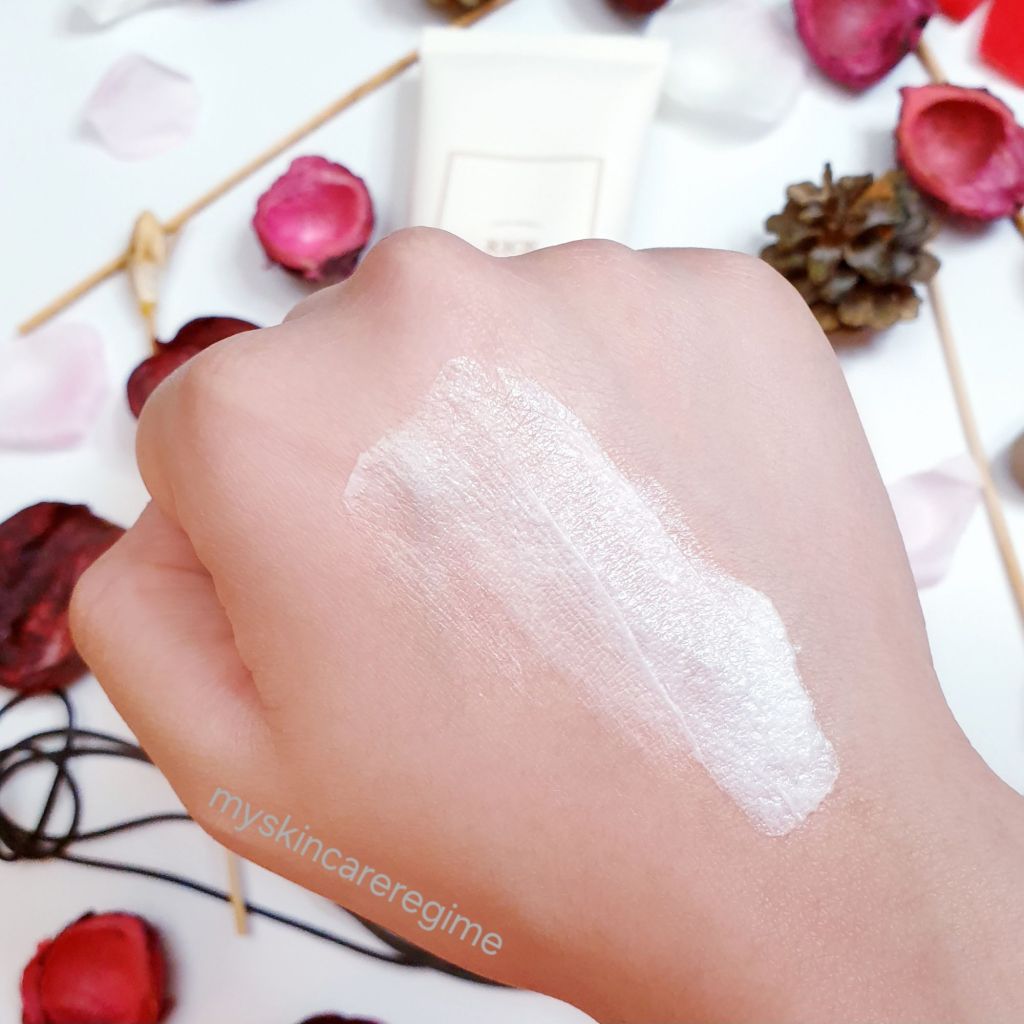 Packaging: Soft squeeze-y plastic tube with a flip-top cap. This is relatively easy to squeeze product out (the cleanser doesn’t shoot out, you’ll see its thickness in the texture swatch below).