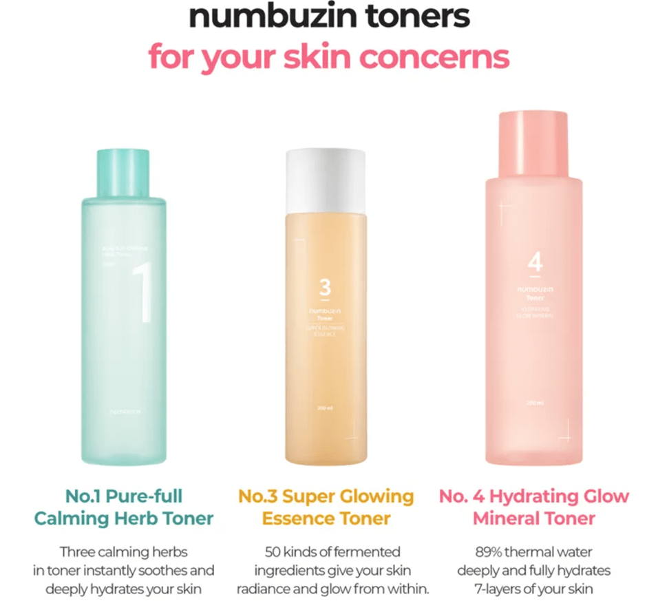 The No. 1 Pure-full Calming Herb Toner: Aimed at Sensitive and Sensitised skins The Mineral Toner – Dull and Dehydrated skins. The Super Glowing Essence Toner: Dry Skins [scented]. The Vitamin-Boosting Toner: Dull and Dry / Combination Skins.