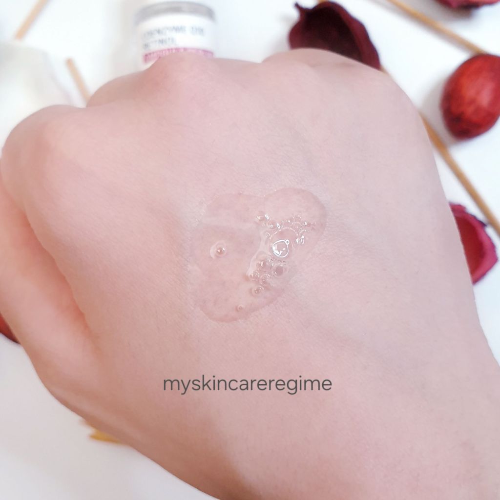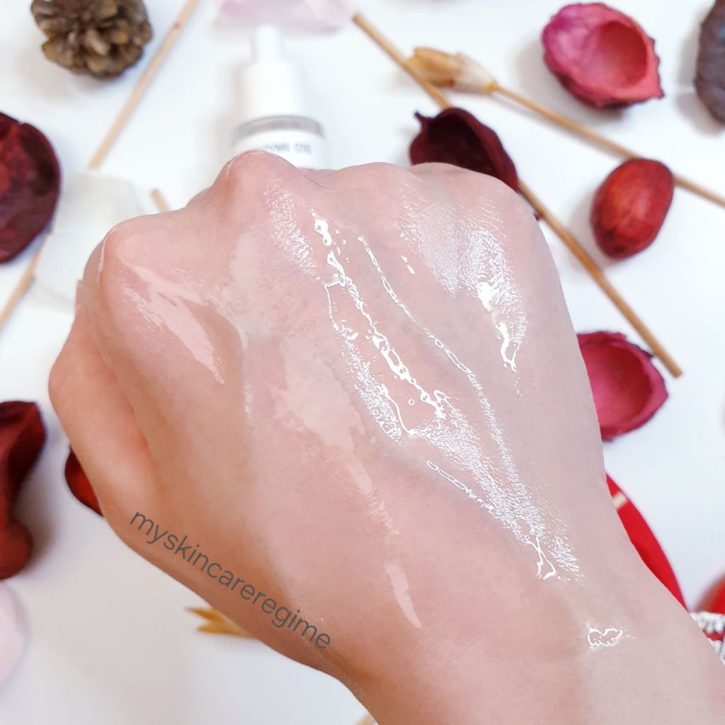 Texture: This is a lightweight, watery serum that is not sticky or tacky, and feels hydrating. It doesn’t take long to absorb either [see swatch video below].